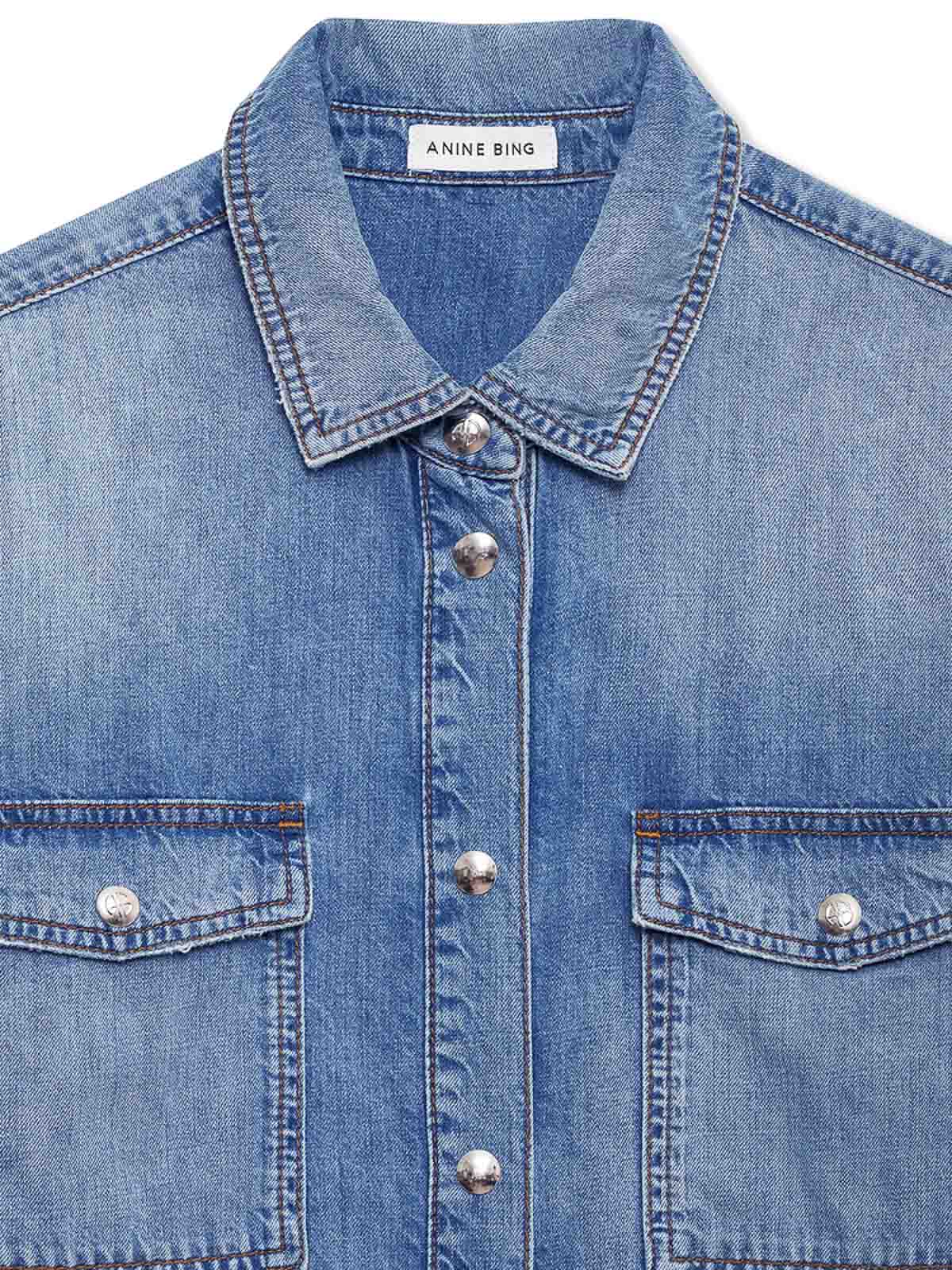 Due tasche sul petto blu con chiusura a bottoni, colletto a punta e maniche lunghe