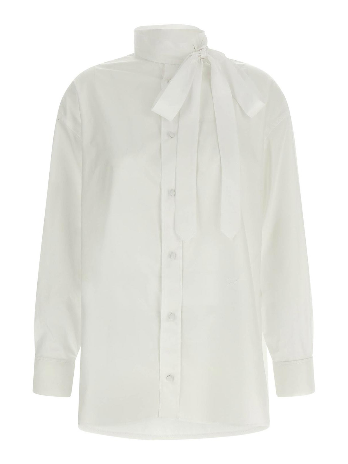 Camicia in popeline di cotone con collo lavallire, logo ricamato tono su tono e chiusura frontale con bottoni, maniche lunghe con gemelli, spalla scesa, spacchetti laterali.