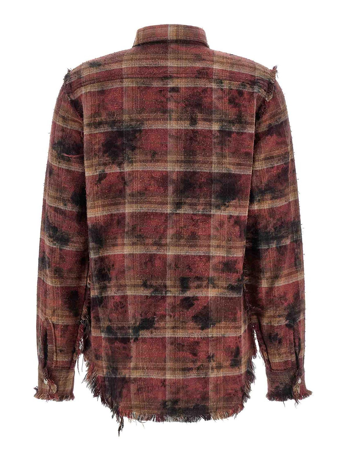 Camicia in cotone pesca con stampa check effetto used, orli sfrangiati, chiusura frontale con bottoni, taschino sul petto, maniche lunghe ampie con polsino e spalla scesa, fondo asimmetrico.