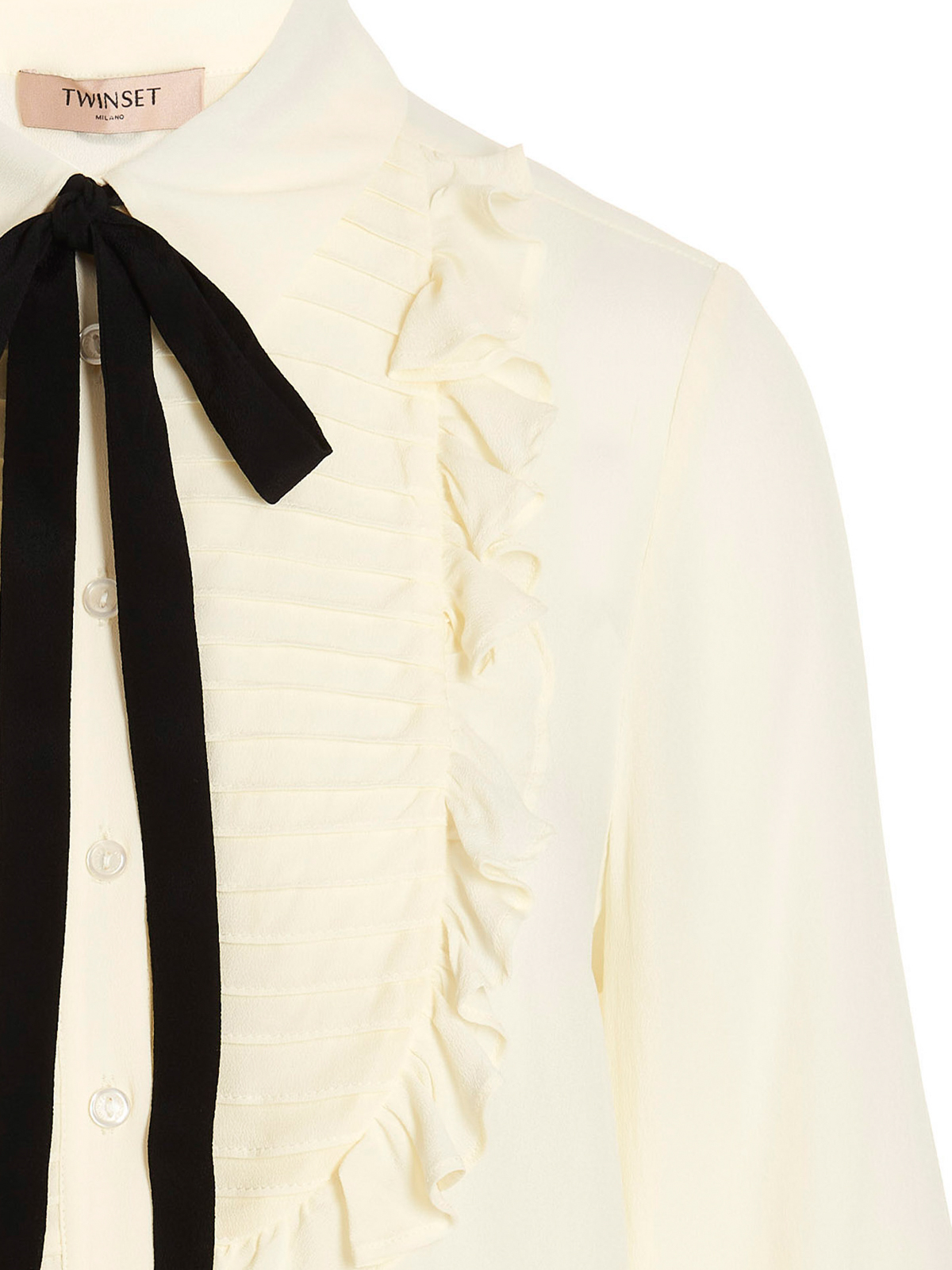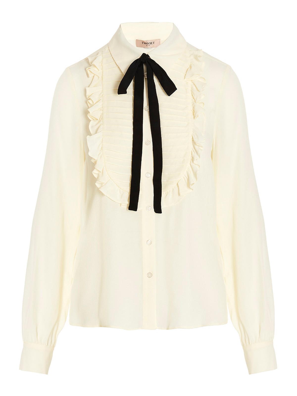 Camicia in misto viscosa e seta con plastron, chiusura con bottoni e maniche lunghe con polsini.