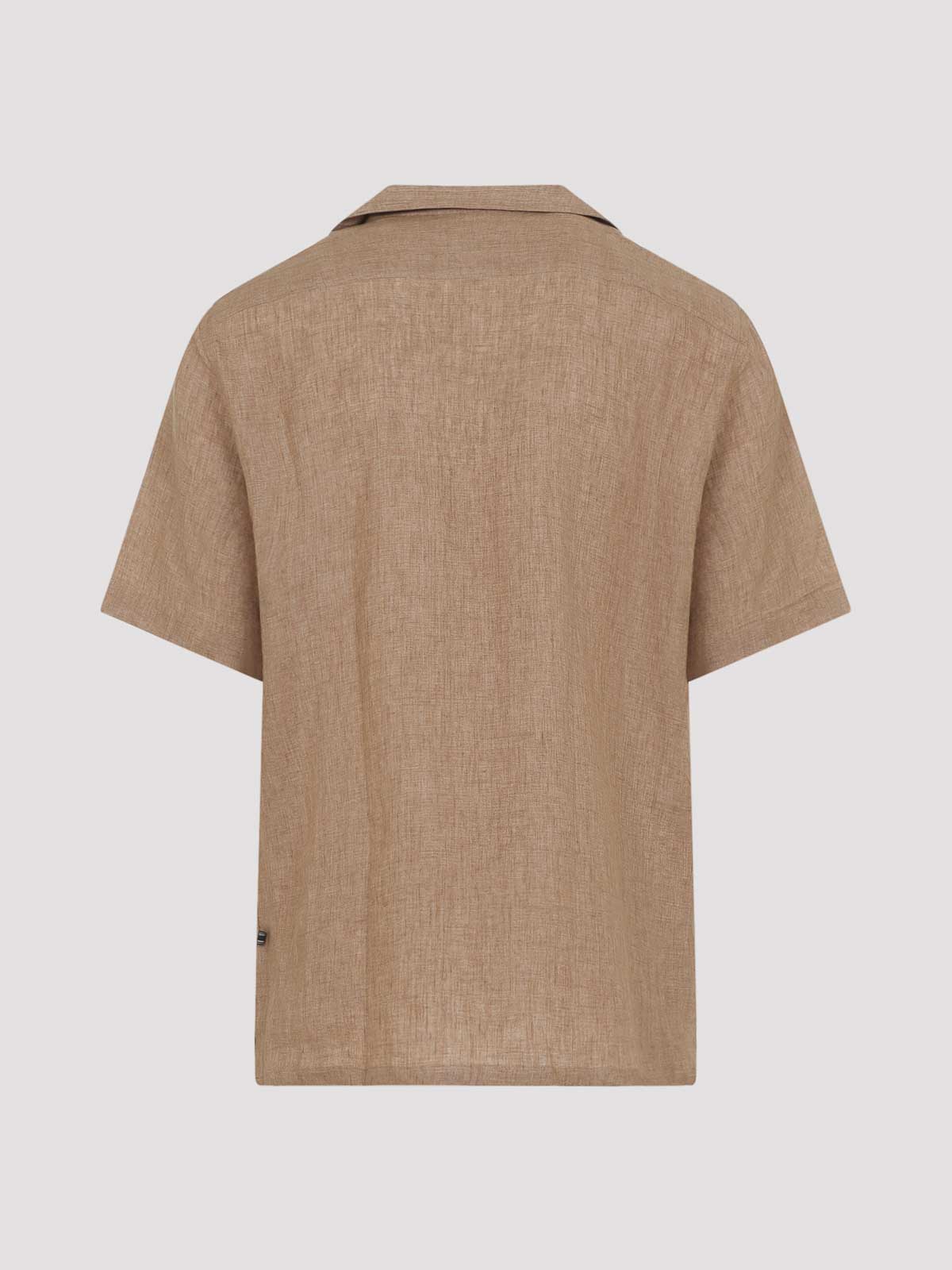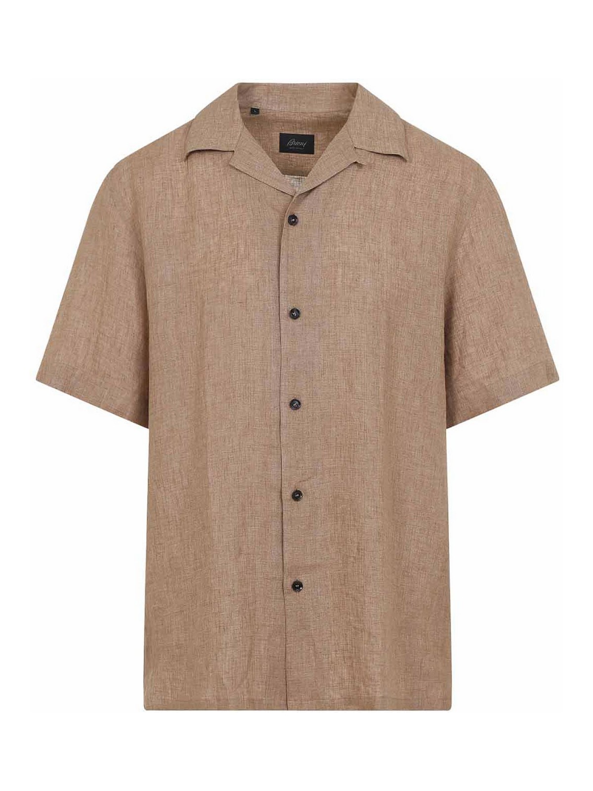 Camicia cubana Brioni in lino beige scuro. realizzato in lino beige scuro, caratterizzato da colletto a bowling, chiusura frontale con bottoni, maniche corte e orlo dritto.