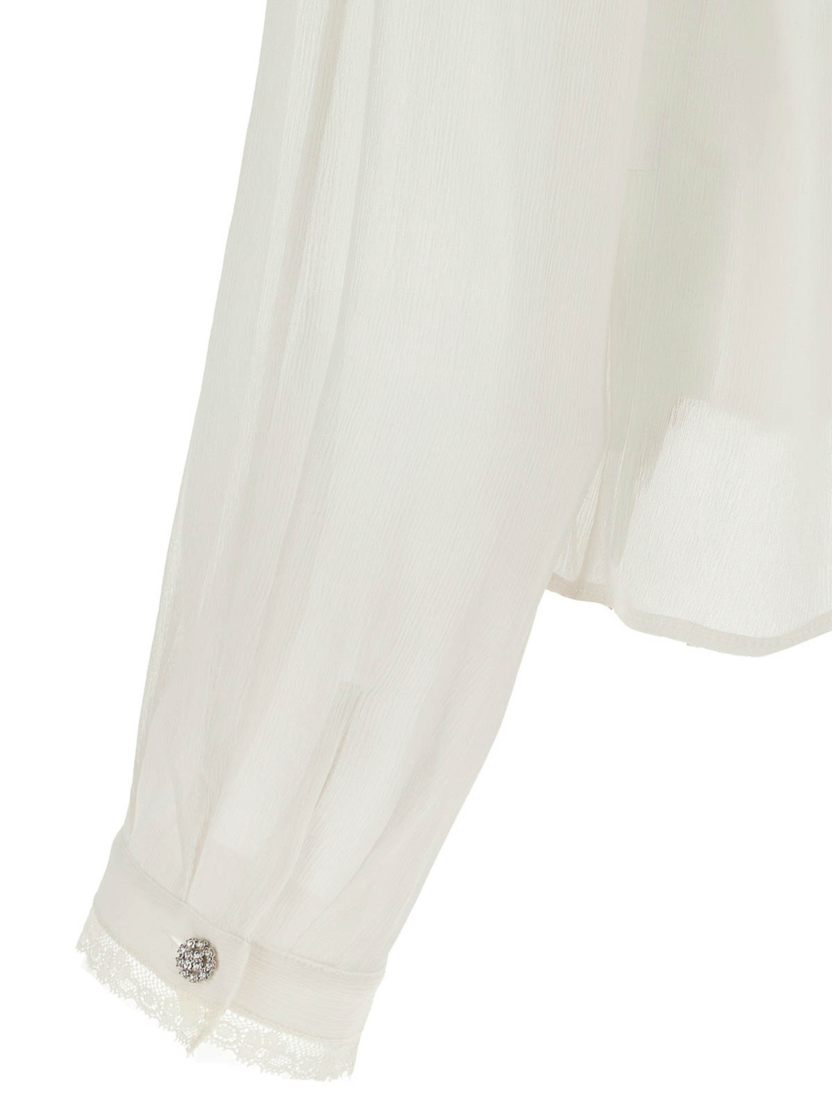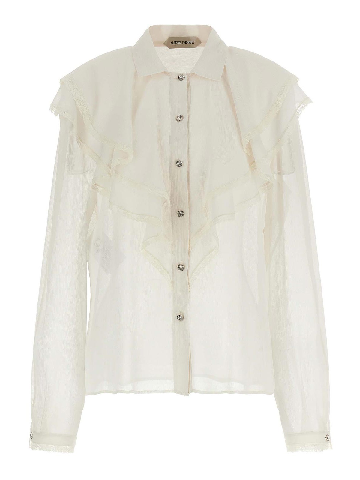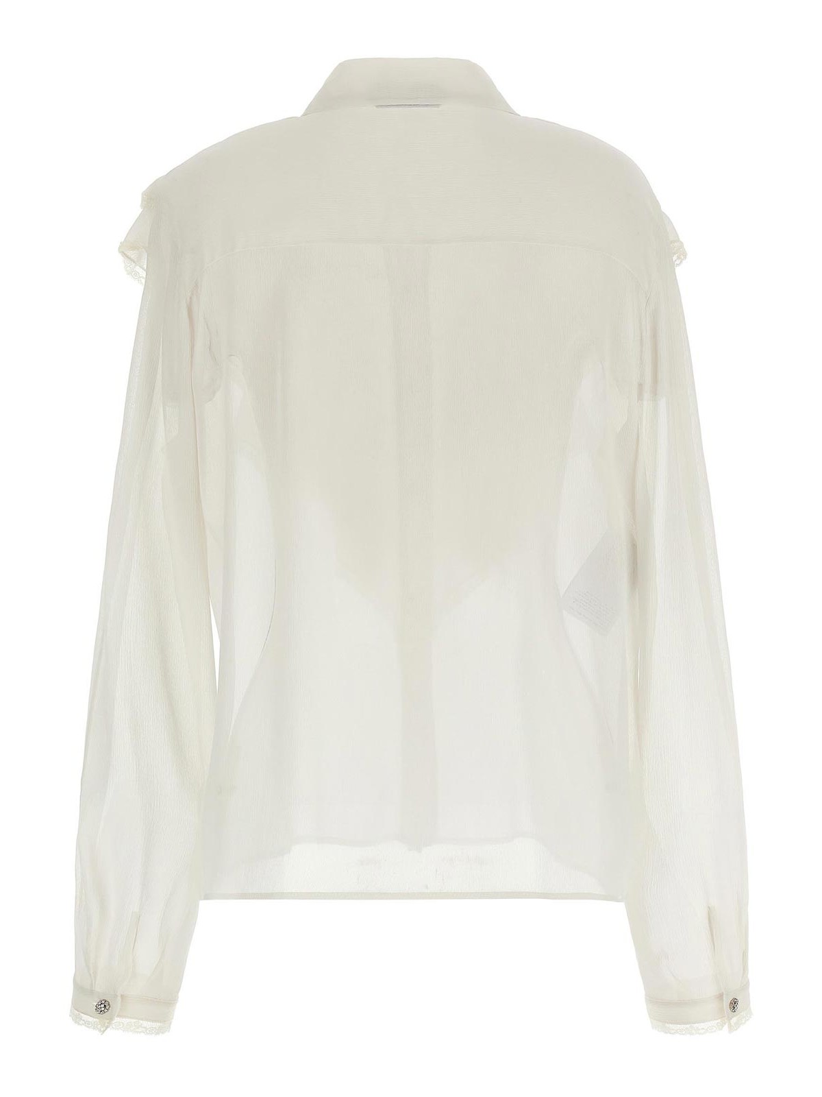 Camicia in crponne di seta semitrasparente con balze profilate in pizzo tono su tono, chiusura frontale con bottoni gioiello, maniche lunghe con polsino.