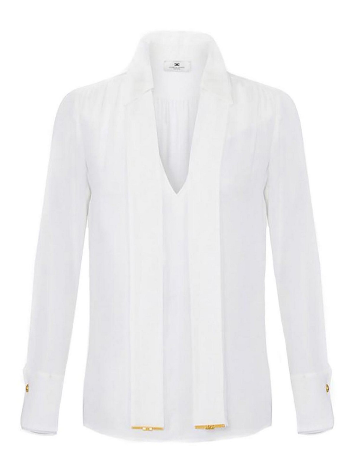 Camicia Elisabetta Franchi in georgette di viscosa con scollo a V e maniche lunghe, caratterizzata da una fusciacca che incornicia lo scollo, impreziosita da placchette in metallo dorato alle estremità.