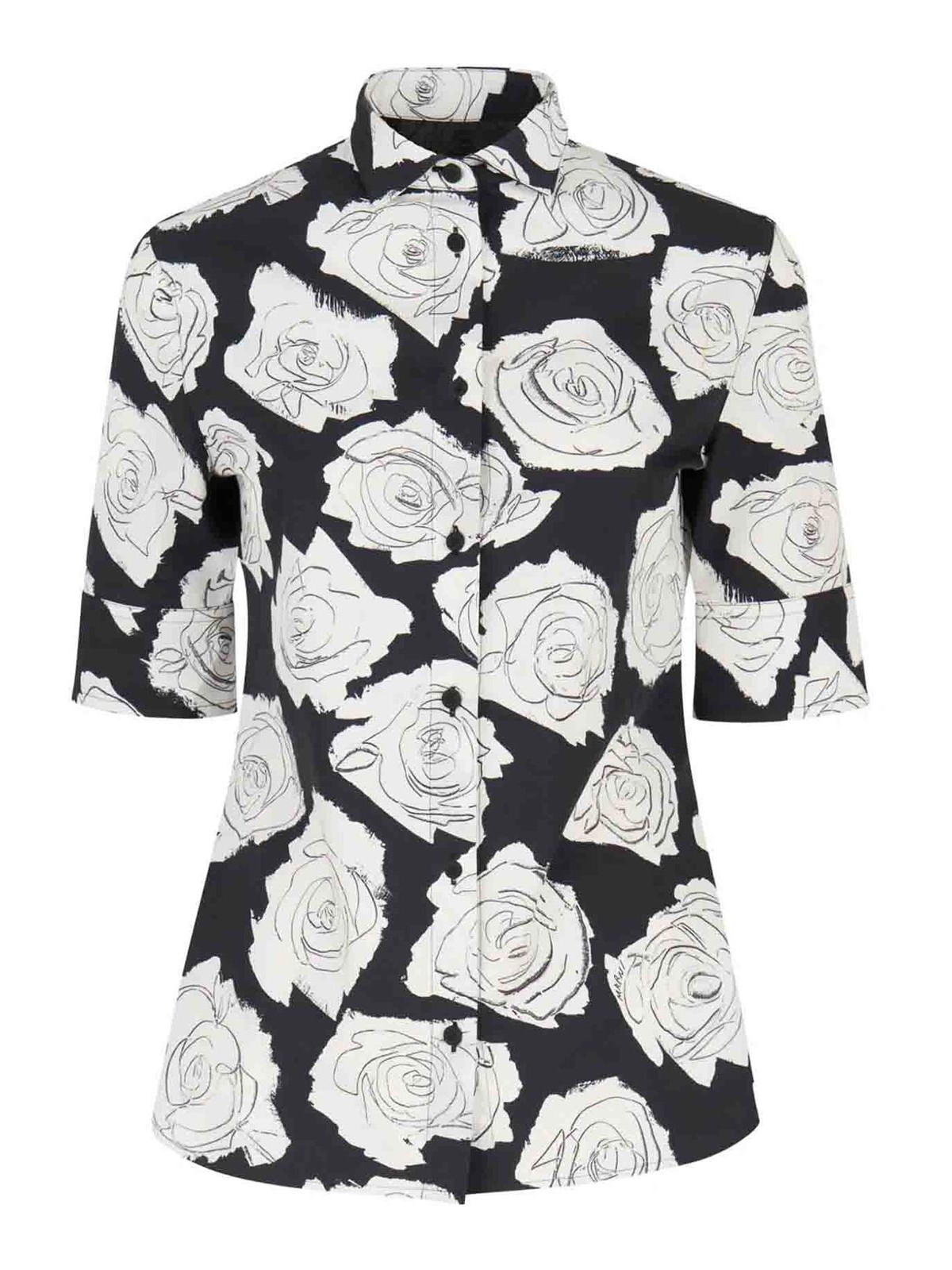 Modello di sfondo nero, stampa rosa, maniche corte, colletto classico, chiusura dei pulsanti frontale, orlo curvo.