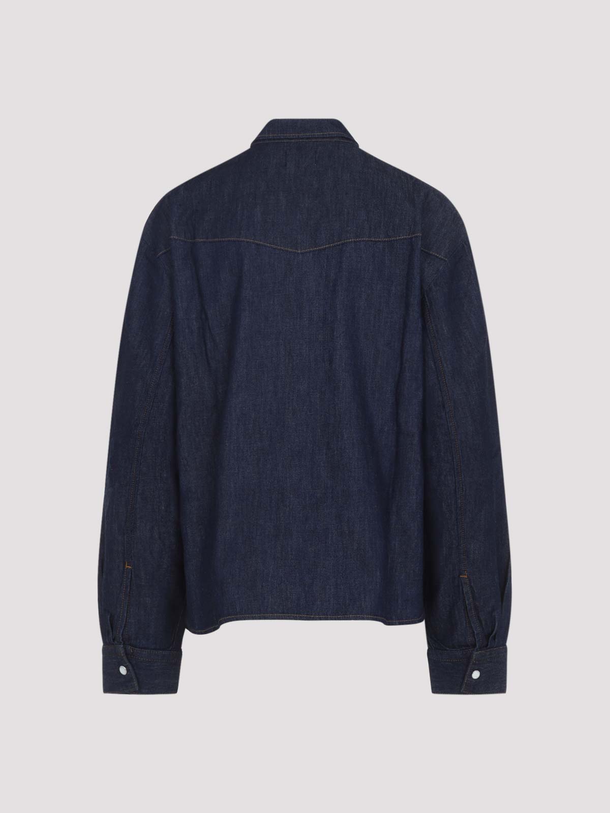 Camicia in cotone blu grenon Khaite. realizzato in denim di cotone blu, caratterizzato da colletto a punta, chiusura con bottoni in madreperla, due tasche con patta sul petto, carré davanti e dietro, maniche lunghe con polsini con bottoni e fondo arrotondato.