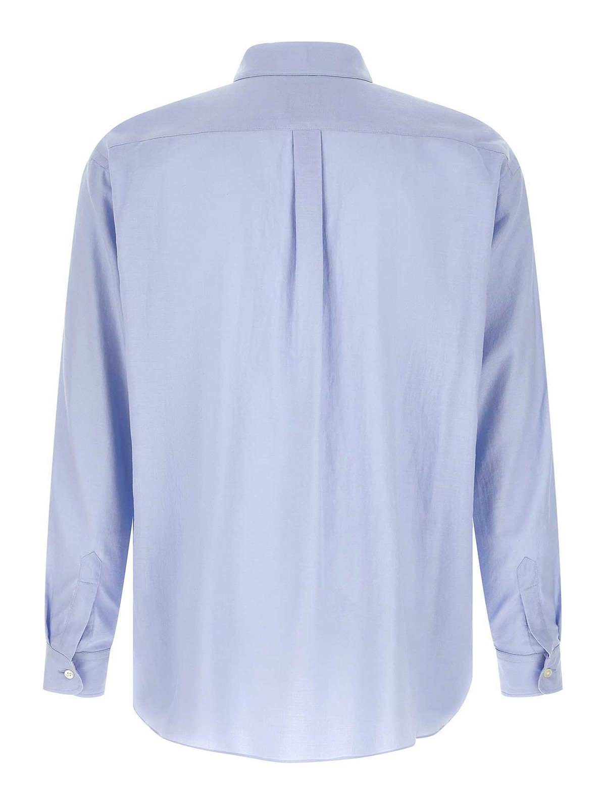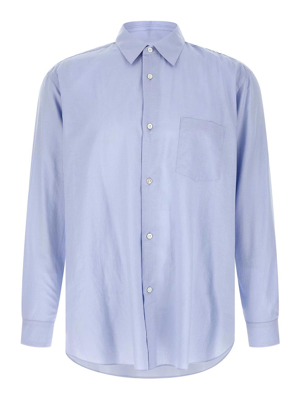 Camicia in misto cotone e seta composta da filato di cotone 100/1 per l'ordito e filato di misto cotone/seta 60/1 per la trama con lavorazione di rifinizione a martellatura che conferisce al tessuto estrema morbidezza, colletto classico, taschino sul petto, chiusura frontale con bottoni, maniche lunghe con polsino e spalla scesa, fondo stondato e asimmetrico.