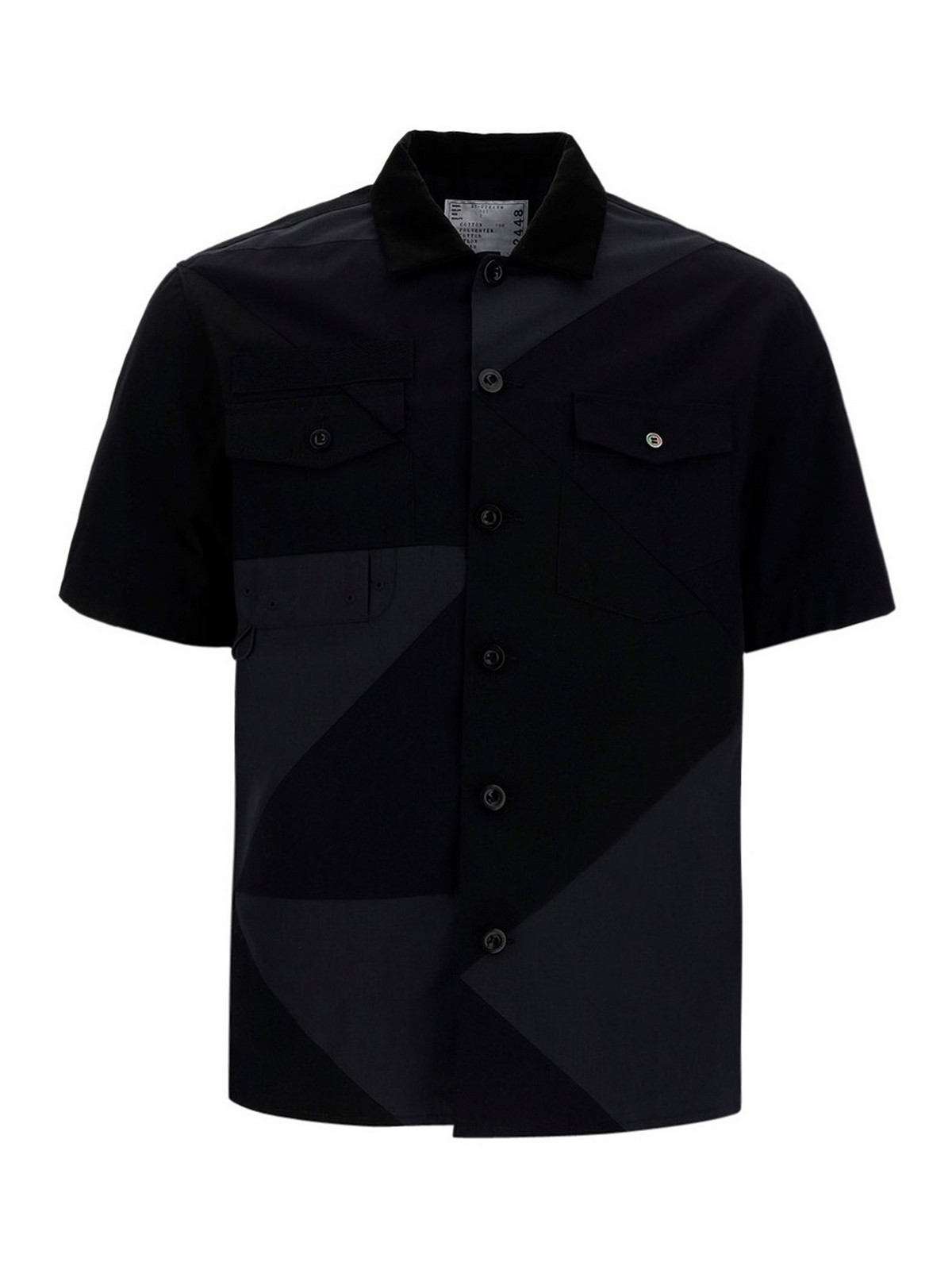 Camicia a mezze maniche in cotone effetto patchwork con colletto francese e tasche a bustina applicate.