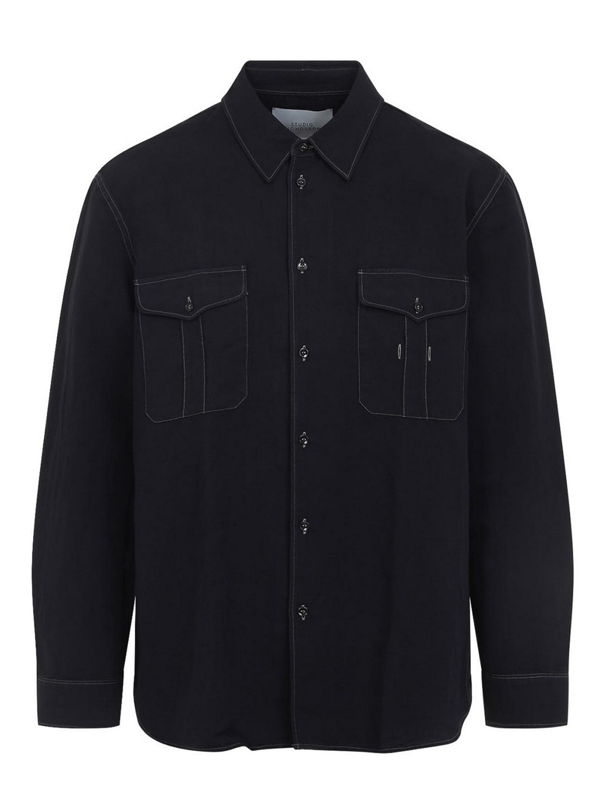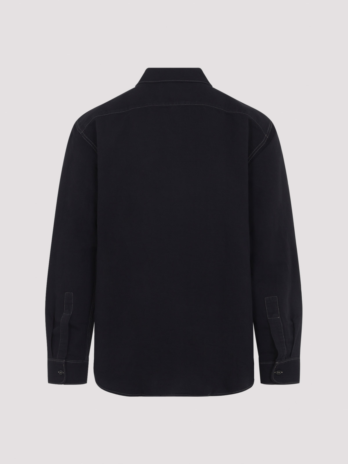 Camicia Studio Nicholson Louro in cotone e lino nero. Camicia dalla vestibilità comoda realizzata in twill di cotone e lino nero, caratterizzata da impunture bianche a contrasto, colletto a punta, chiusura frontale con bottoni, due tasche con patta poste sul petto, spalle scese, maniche lunghe con polsini con bottoni, carré posteriore e orlo arrotondato.