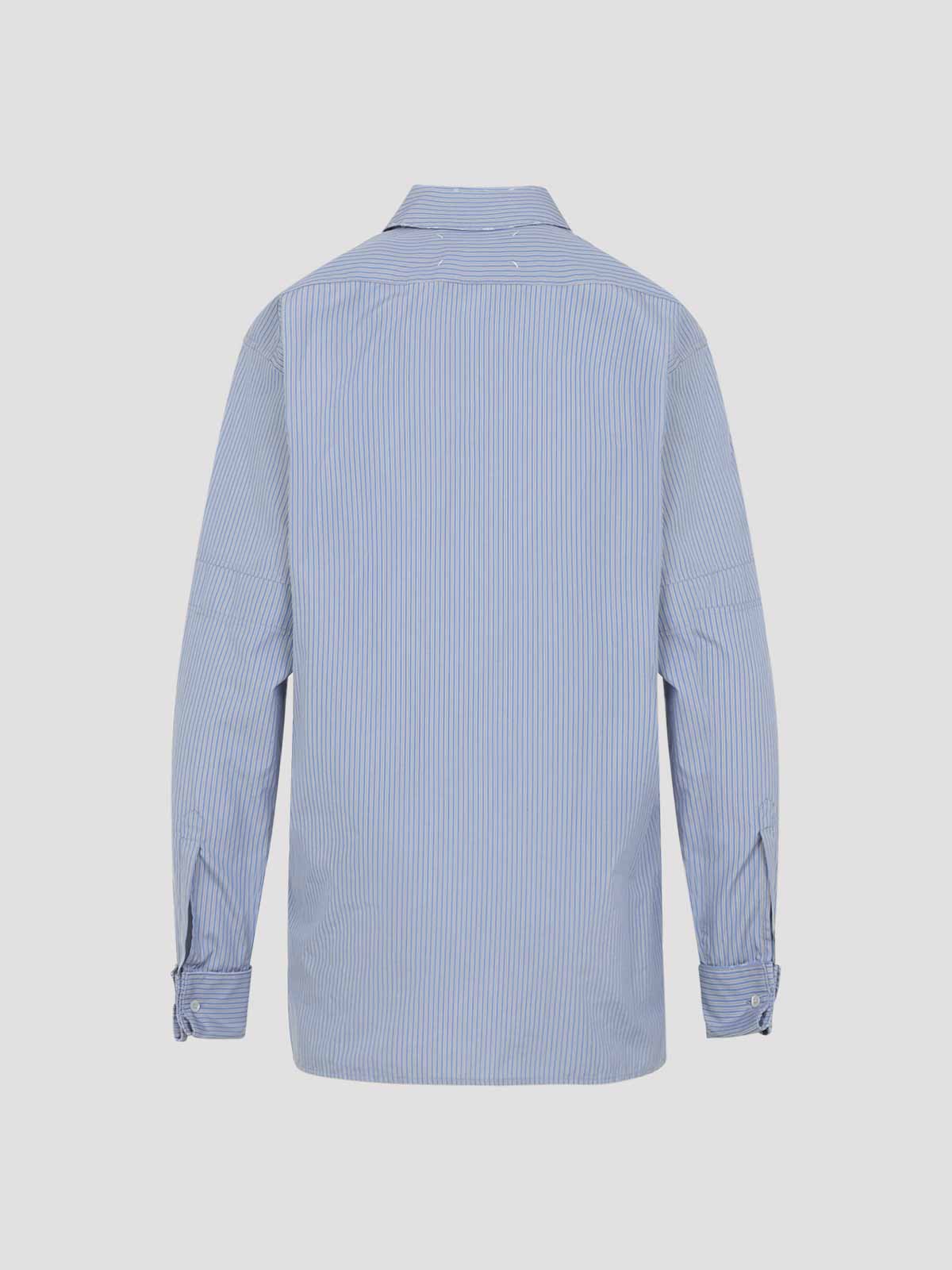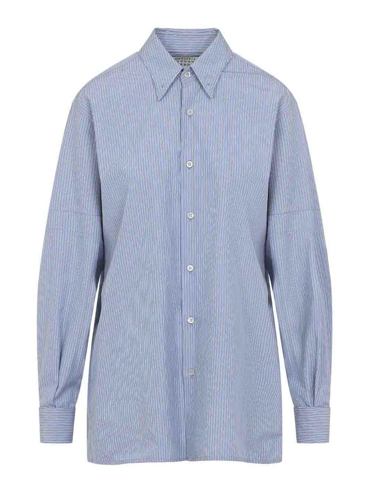 Camicia Maison Margiela in cotone celeste. camicia in puro cotone, colletto a punta, chiusura frontale con bottoni, cucitura bianca a contrasto sul retro, maniche lunghe, polsini con bottoni, fondo dritto. fantasia a righe azzurre e grigie all-over.