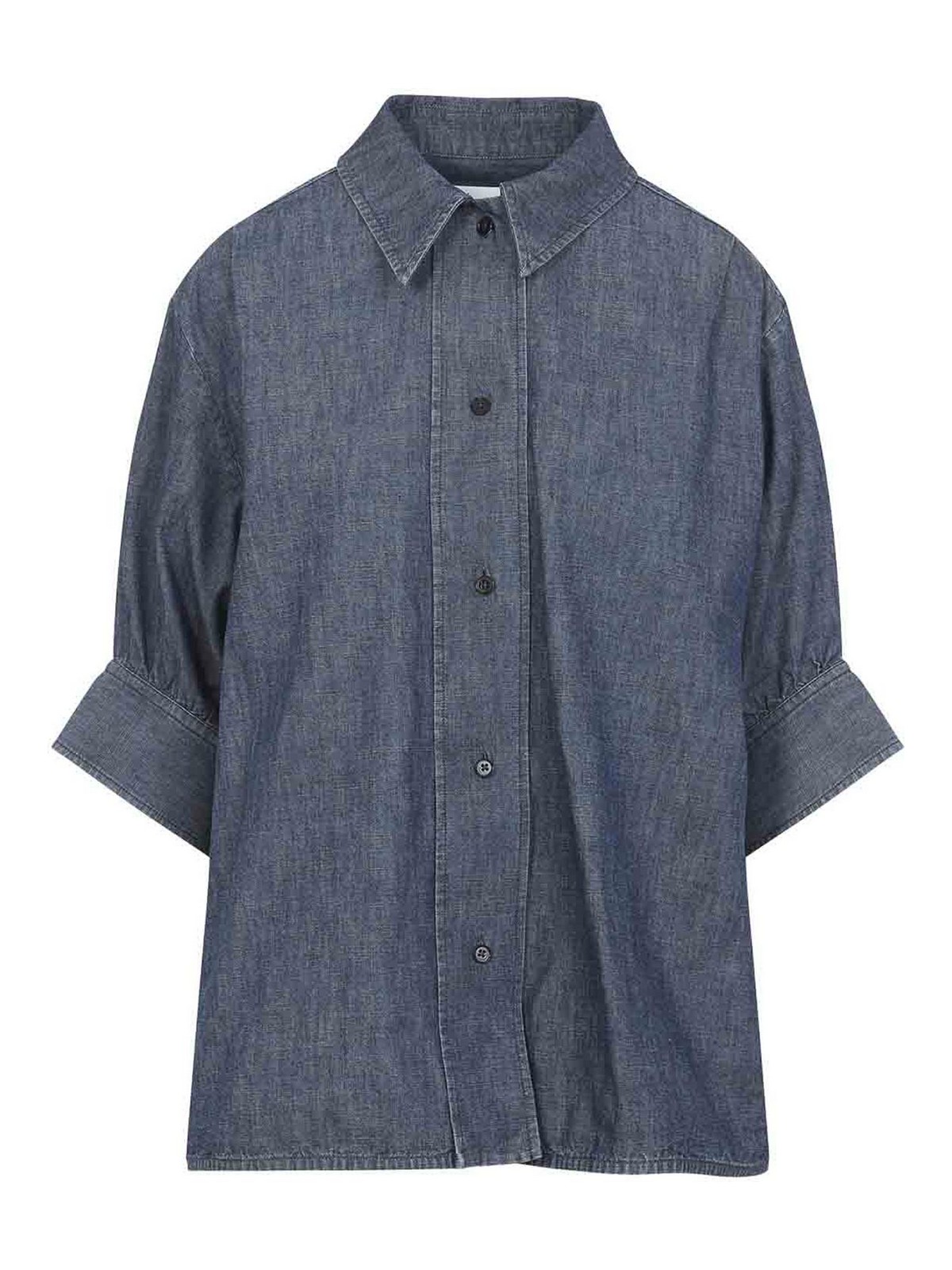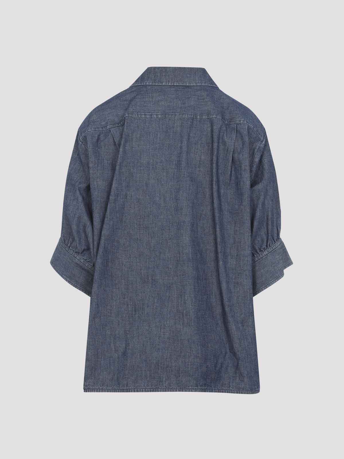 Camicia squadrata in cotone blu di Jil Sander. Camicia con maniche a tre quarti realizzata in cotone blu indaco, caratterizzata da colletto a punta, chiusura frontale con bottoni, spalla scesa, carré posteriore e due pieghe, e fondo dritto.