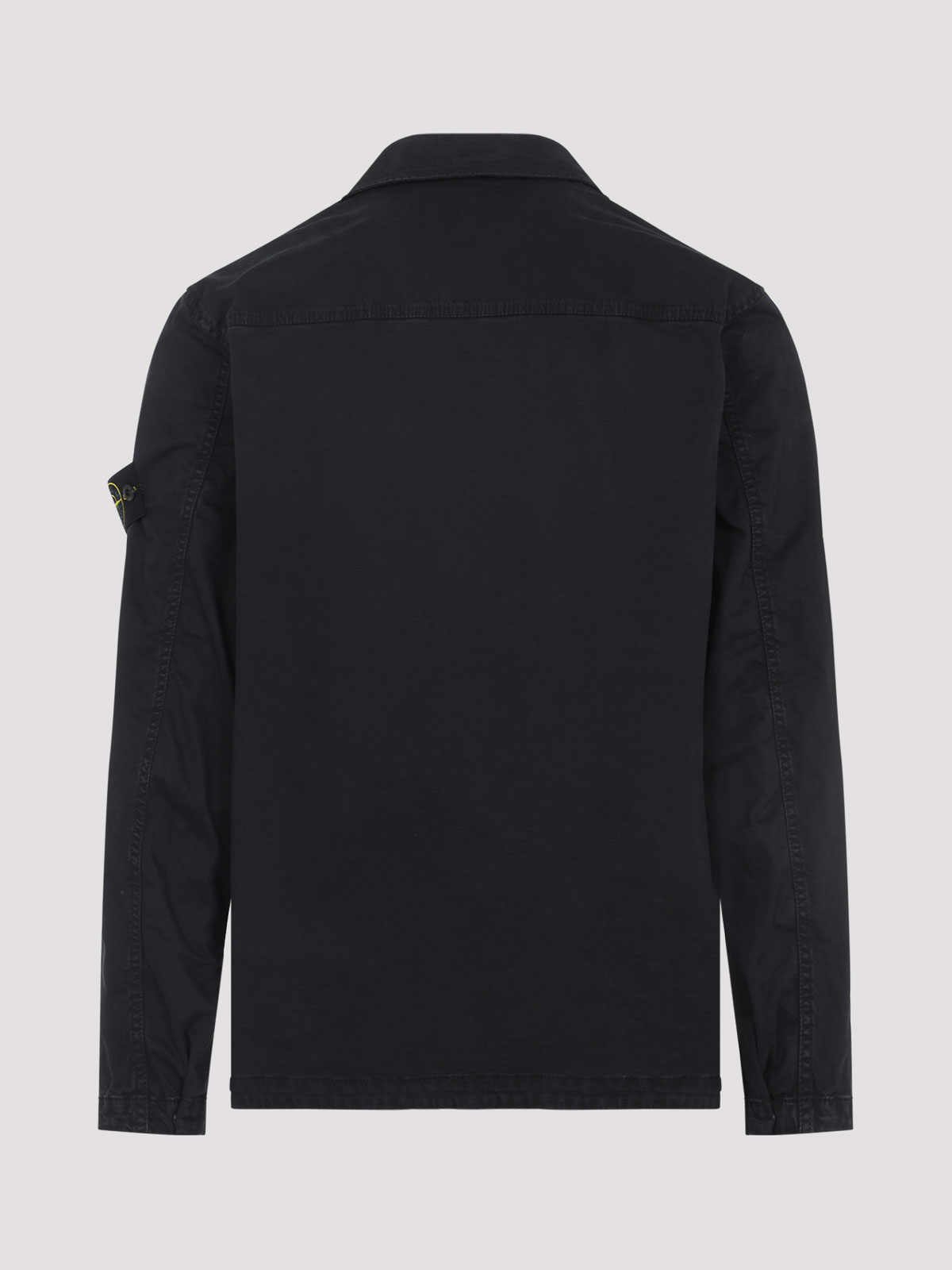 Camicia Stone Island in cotone nero. realizzato in misto cotone ed elastan. colletto a punta, chiusura frontale nascosta, tasca con patta sul petto, maniche lunghe, patch logo sulla manica destra, polsini con bottoni, fondo dritto.
