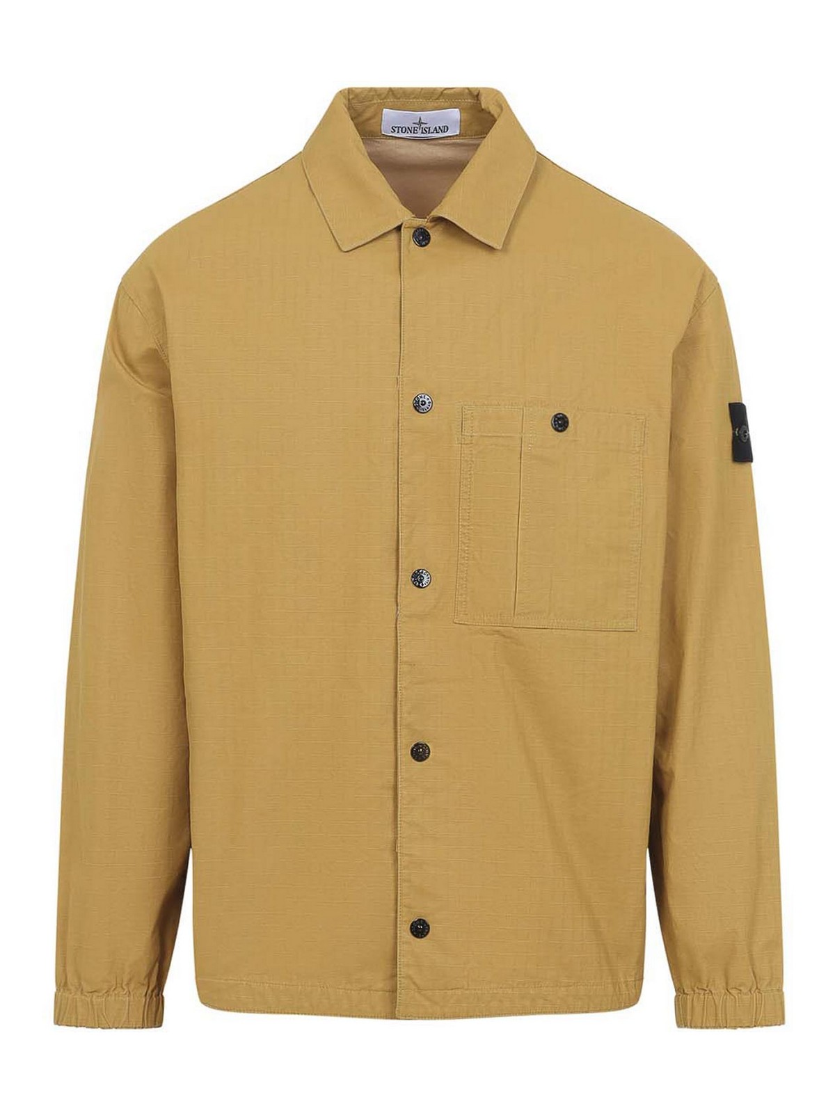 Camicia Stone Island in cotone giallo senape. Camicia in puro cotone giallo senape, colletto a punta, chiusura frontale con bottoni, taschino con bottone sul petto, maniche lunghe, patch logo sulla manica destra, polsini elasticizzati, fondo dritto, interamente foderata.