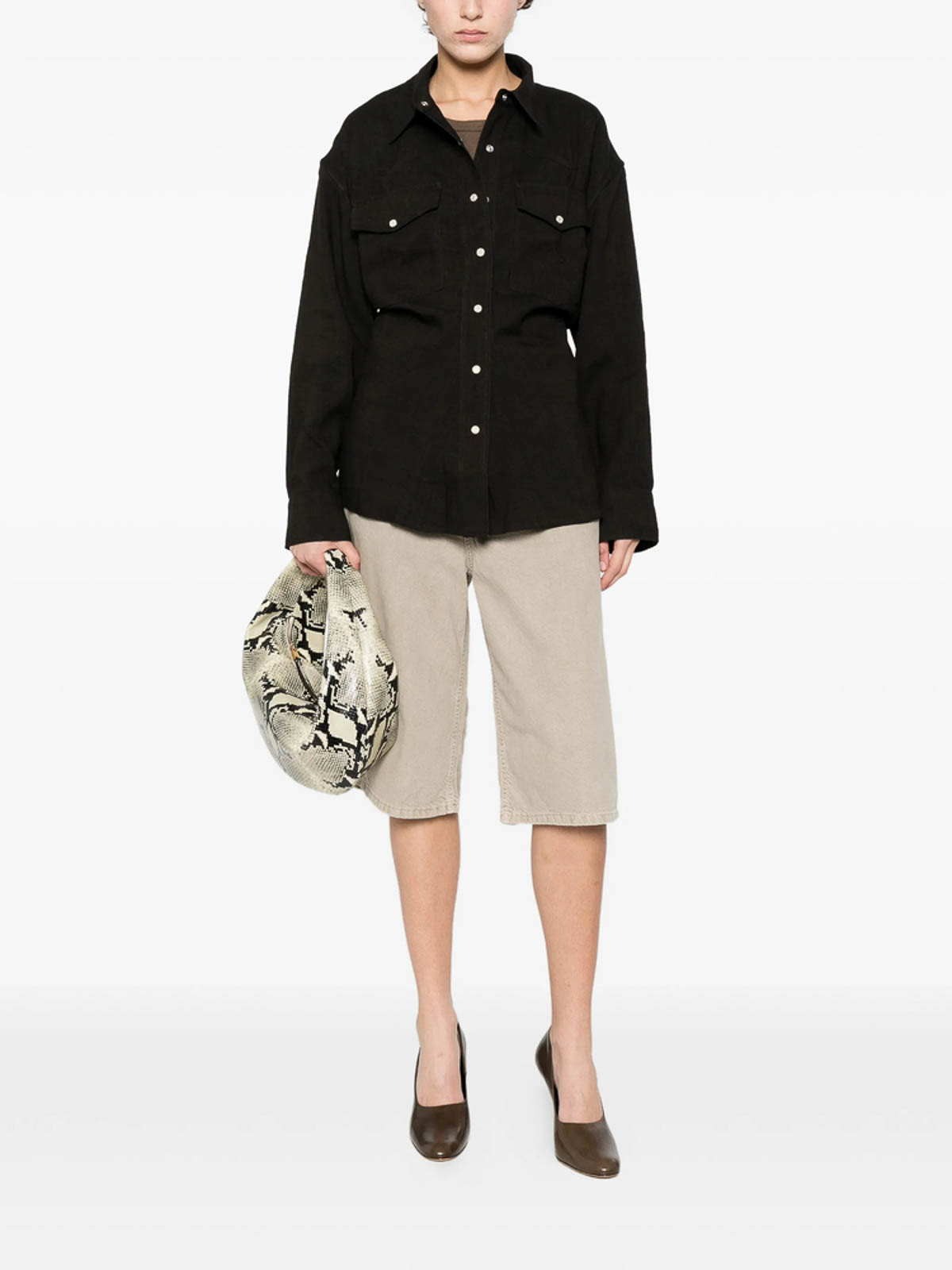 Espresso nero chiusura frontale con bottoni tasche applicate sul petto maniche lunghe colletto a punta carré posteriore