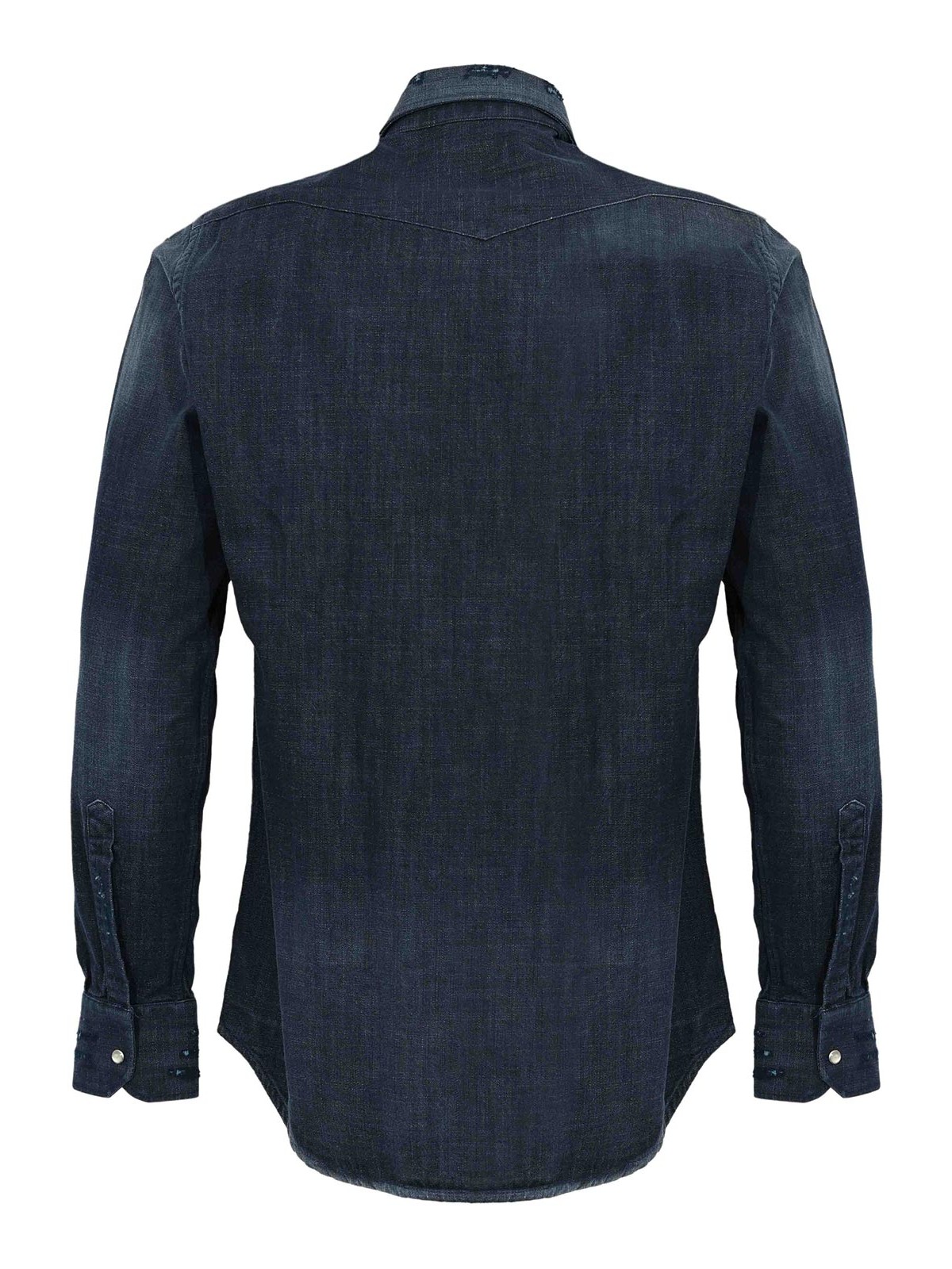 Camicia in denim scuro da uomo, sartorio, modello texas, tessuto: denim di cotone, fantasia: tinta unita, maniche: lunghe con polsino e bottoni, collo: classico, chiusura: bottoni a pressione, tasche: due tasche frontali con pattina e bottone a pressione, dettagli: leggere abrasioni effetto used su collo e tasche, foderato: no, vestibilità: regolare