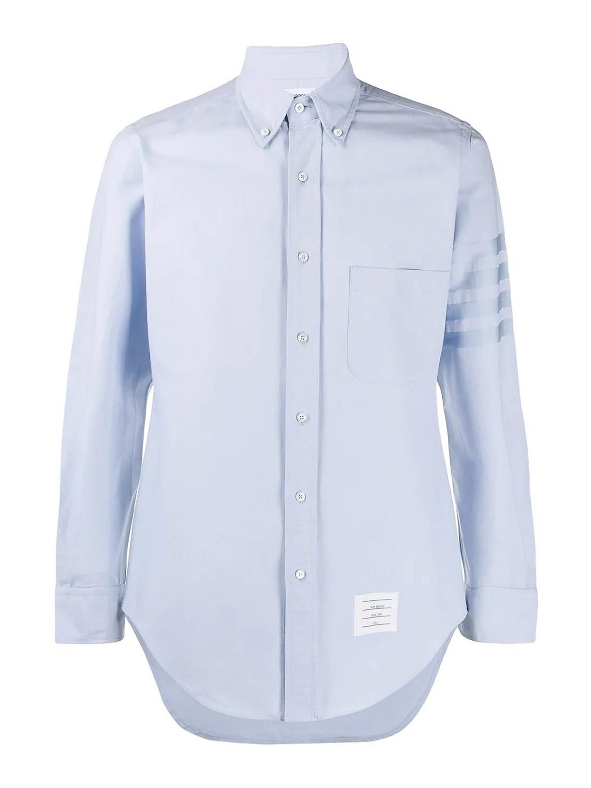 Quattro colpi e sei Thom Browne. Realizzata in cotone azzurro, questa classica camicia oxford mette in mostra l'iconico dettaglio a 4 barre sulla manica. Modello con colletto button-down, chiusura frontale con bottoni, maniche lunghe, polsini con bottoni, tasca sul petto e toppa con logo frontale.