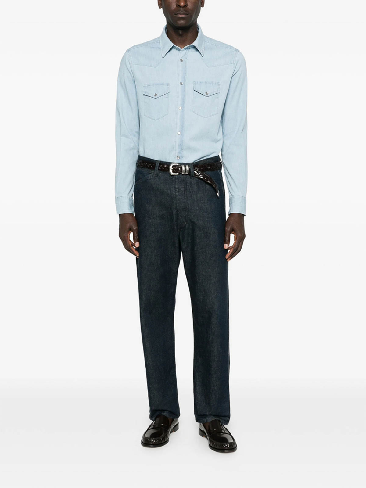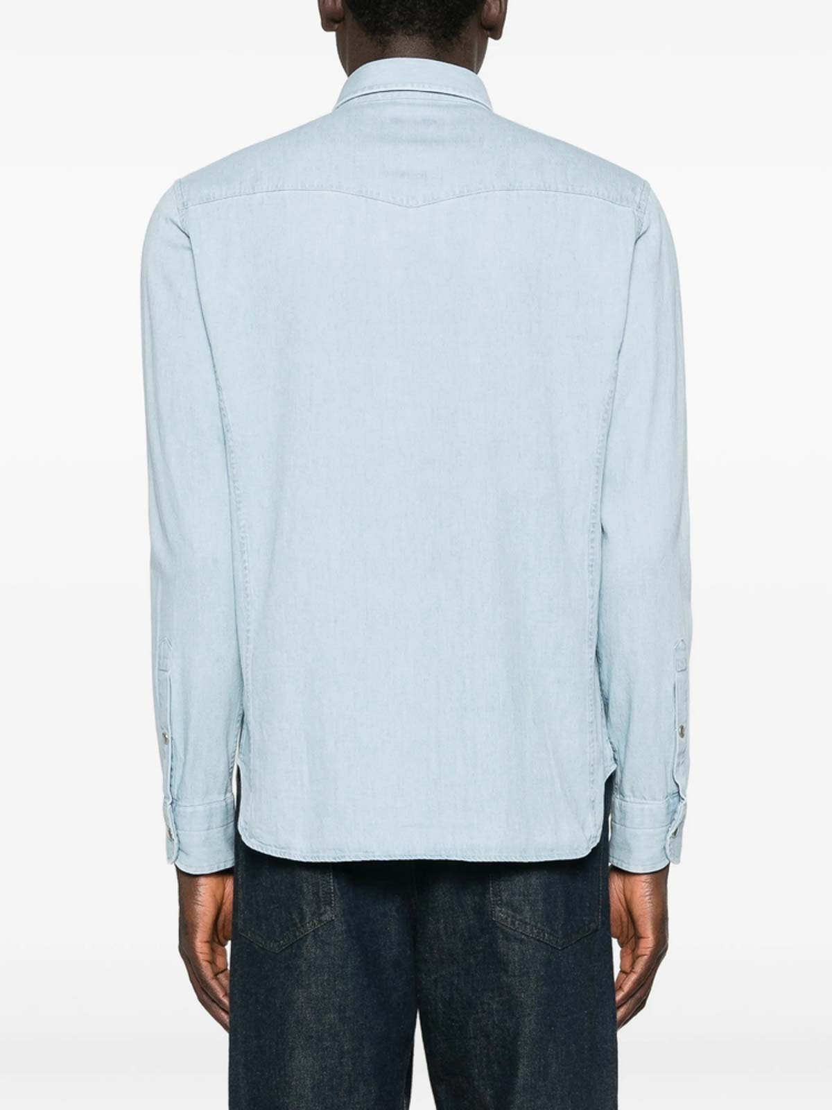 Chiusura con bottoni azzurri maniche lunghe colletto a punta tasche sul petto chiusura con bottoni