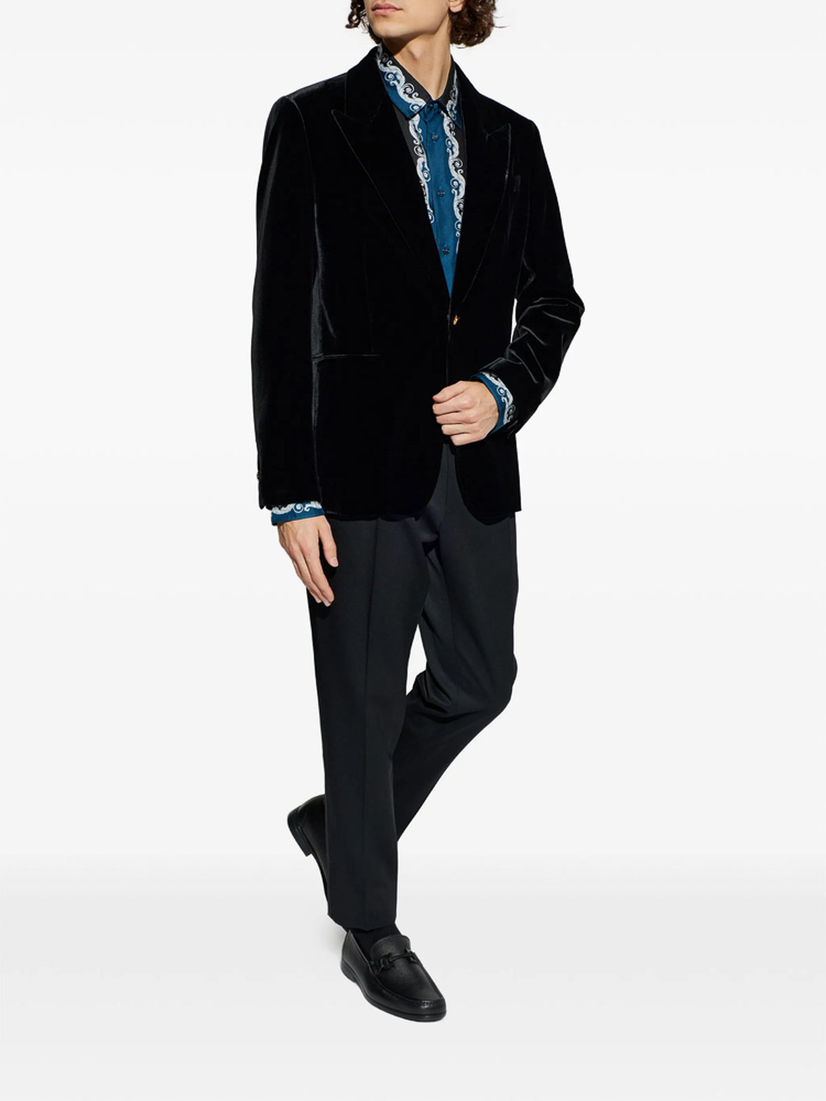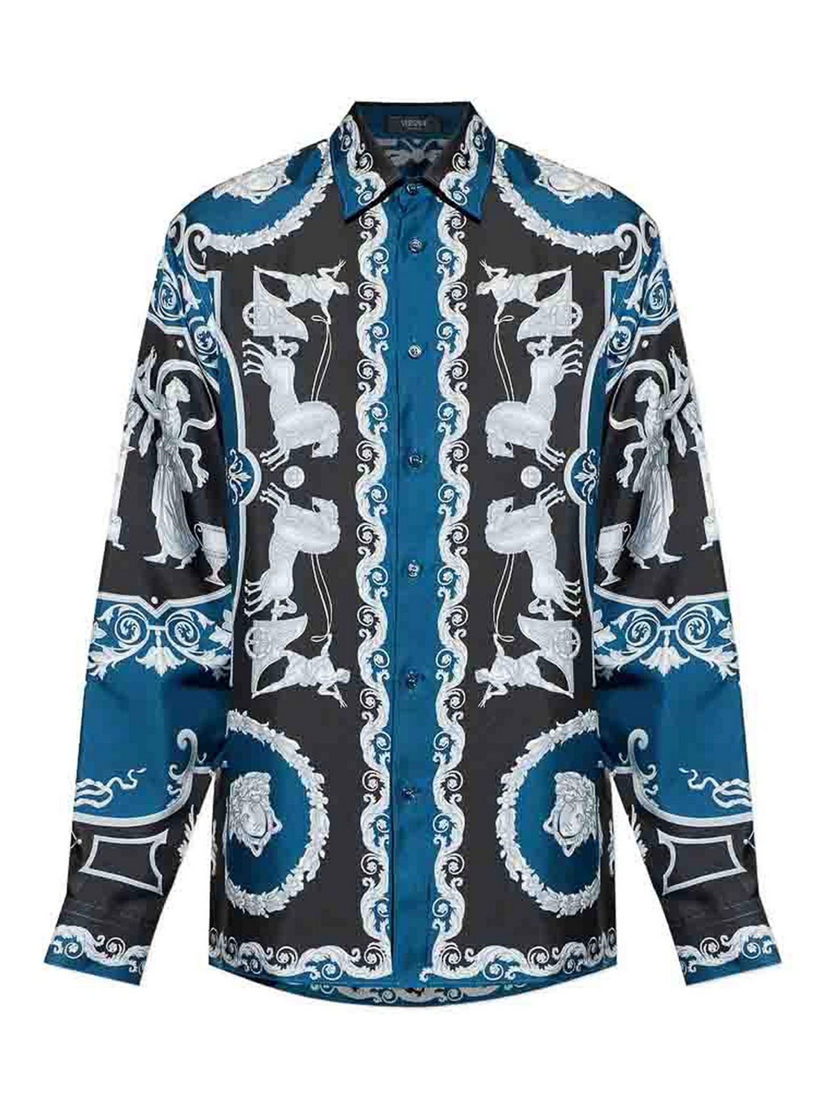 Stampa blu della sala degli eroi con chiusura a bottoni, maniche lunghe, polsini con bottoni