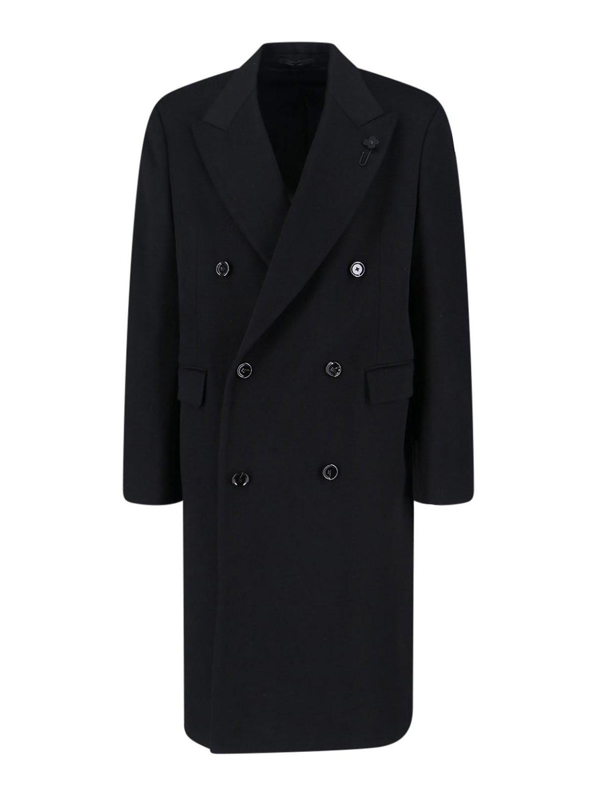 Cappotto doppiopetto in lana vergine lardini, nero, revers a lancia, chiusura bottoni, dettaglio charm logo in metallo, due tasche laterali, bottoni polsini, spacco profondo retro, orlo dritto.