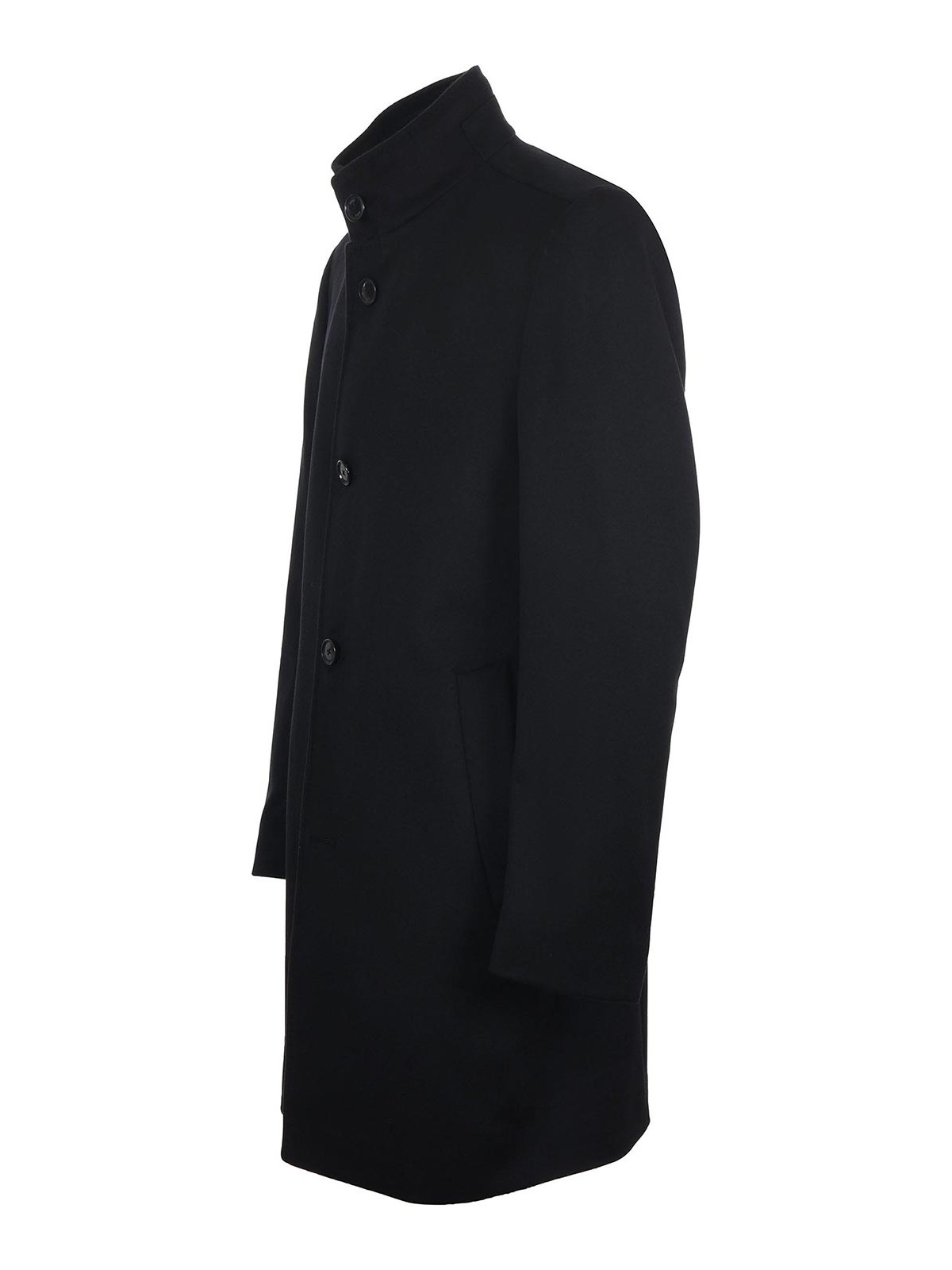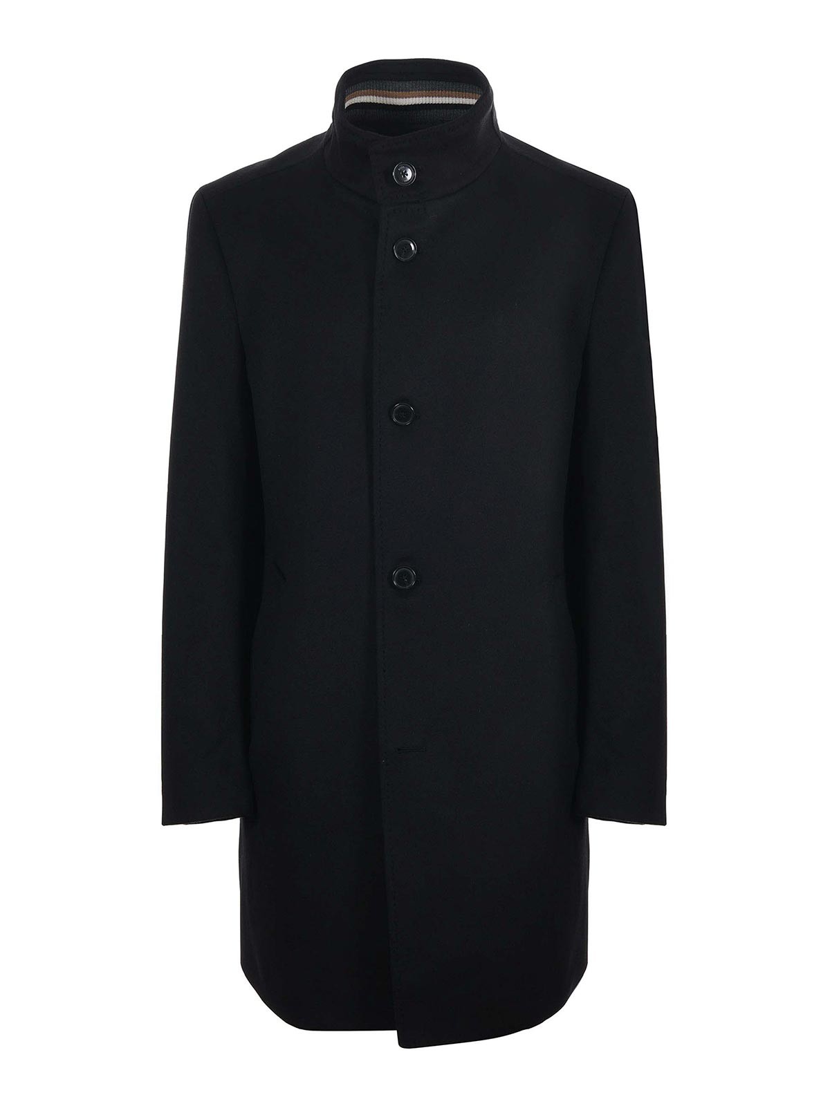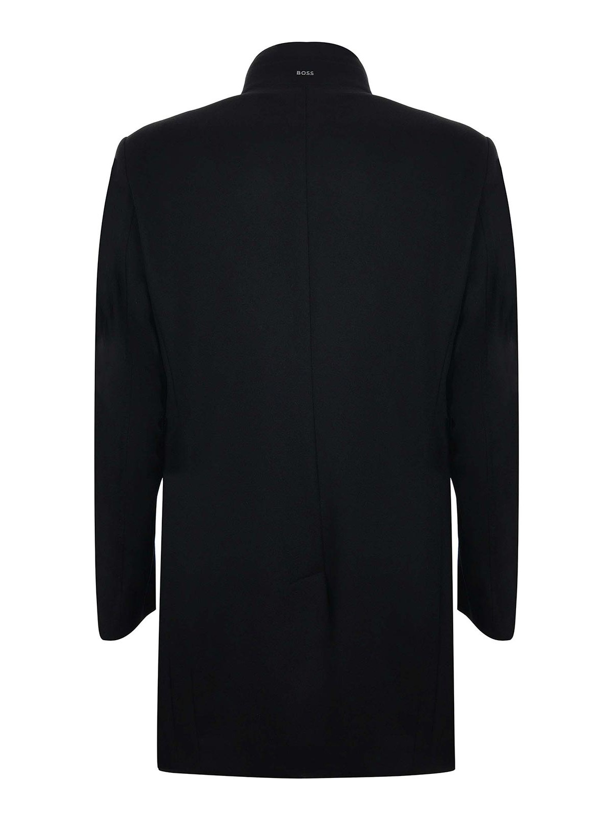 Cappotto Boss in misto lana e cashmere nero. colletto rialzato con bottoni. tasche inserite. tasche interne. foderato. chiusura con bottoni. spacco posteriore. vestibilità slim. taglia mostrata: 50 90% lana, 10% cashmere
