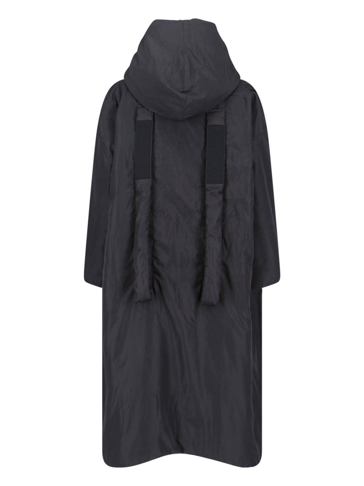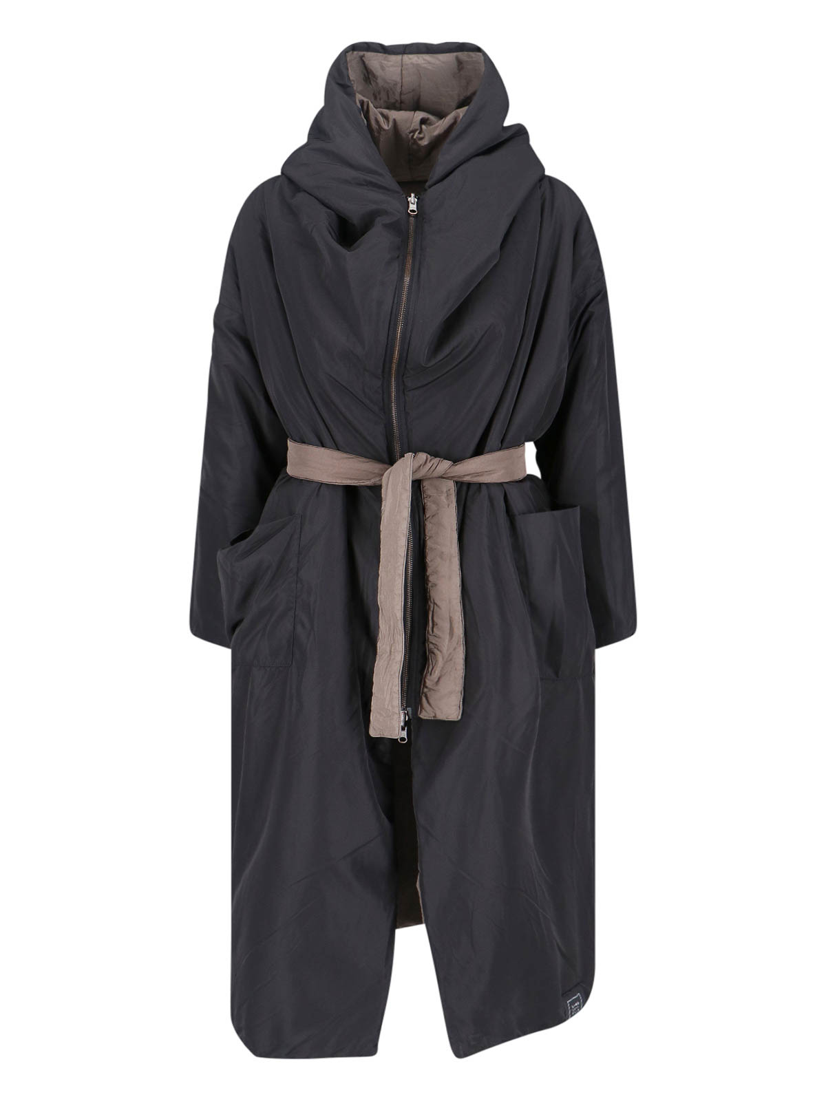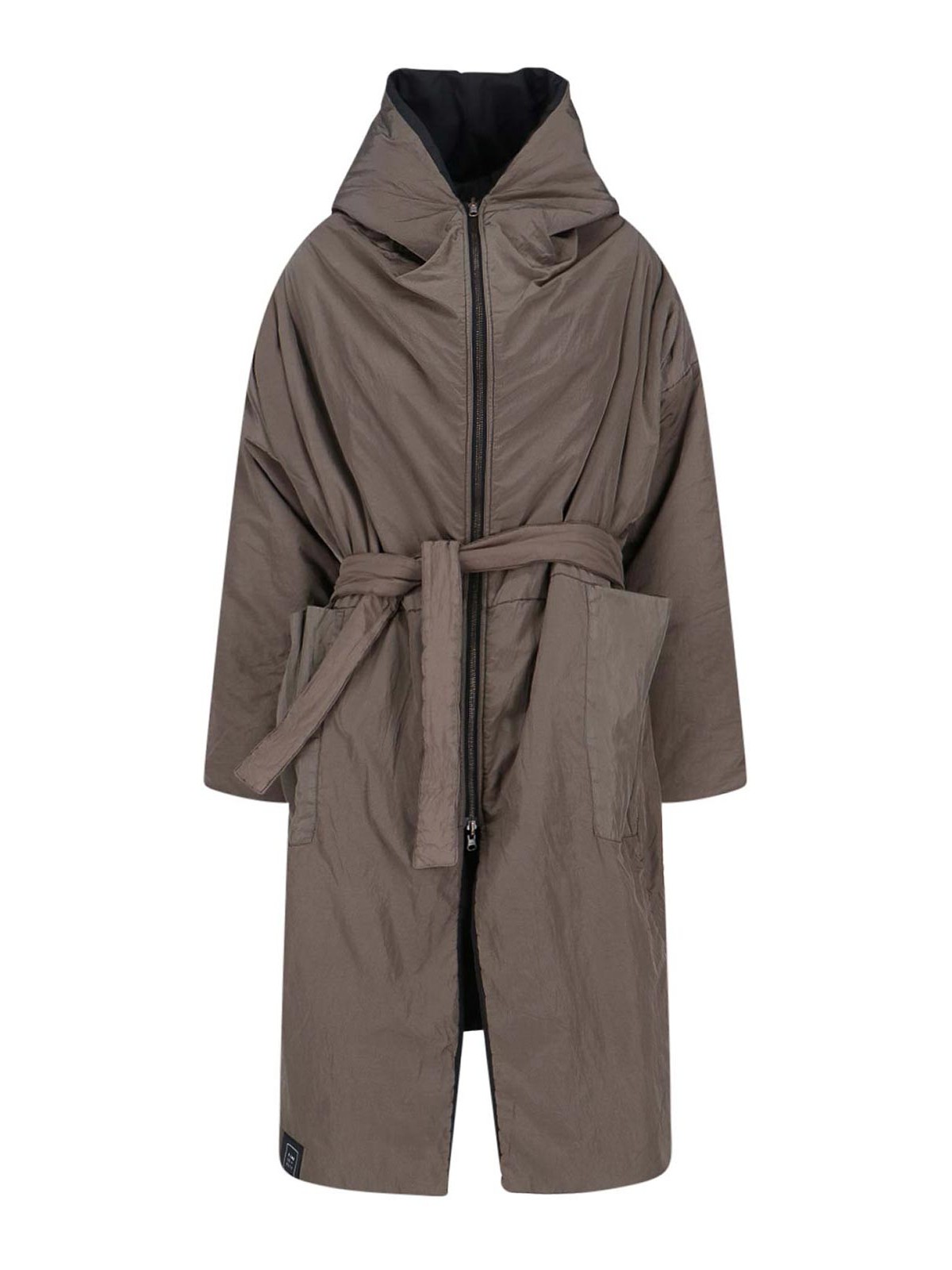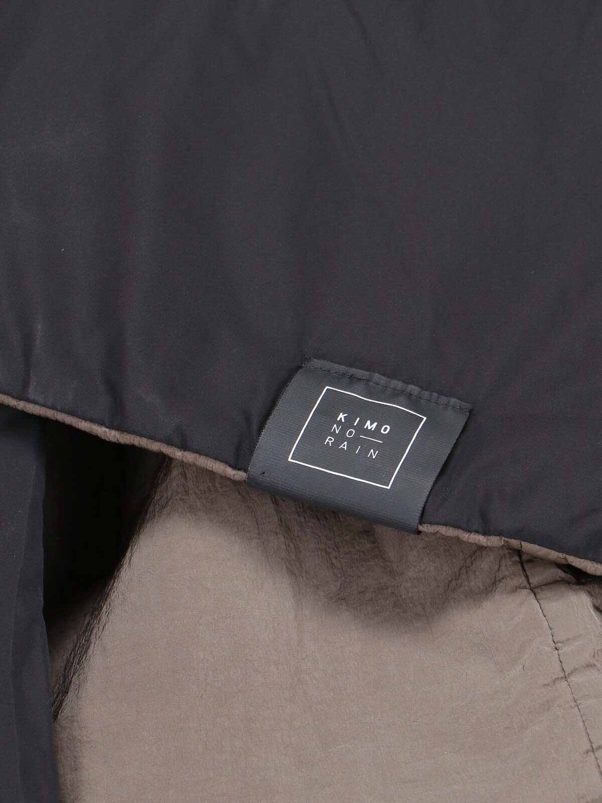 Cappotto impermeabile reversibile kimo no-rain, in tessuto marrone da un lato, nero dall'altro, cappuccio, chiusura zip, cintura regolabile in vita, due tasche piatte laterali, etichetta logo su fondo, spallacci retro, spacco profondo fronte, orlo dritto.