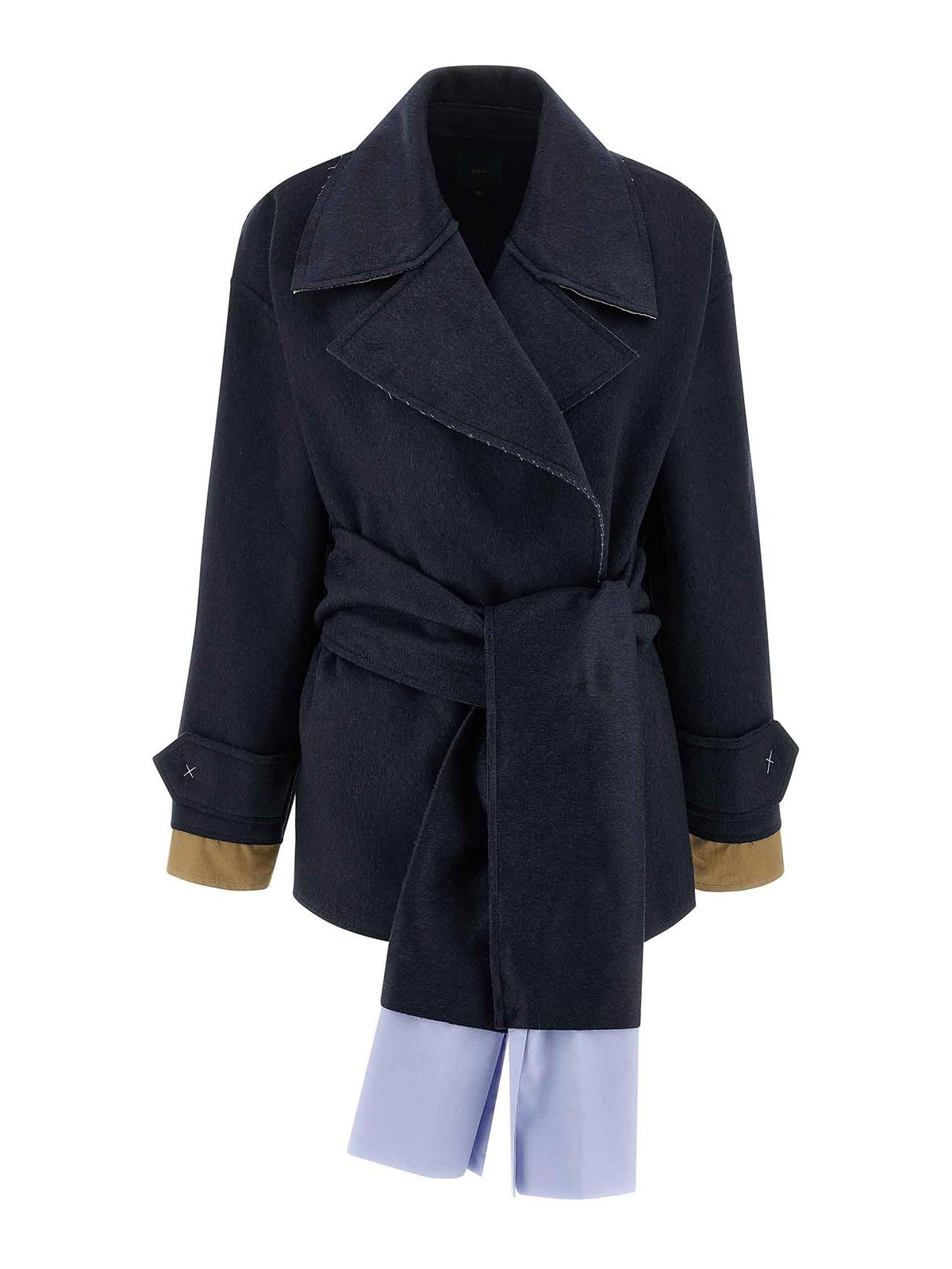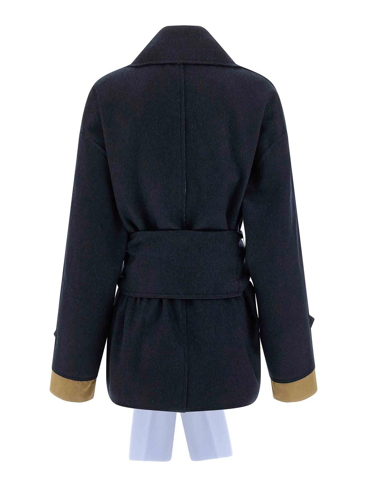 Cappotto a vestaglia in panno di lana vergine e cashmere, collo con revers, tasche, maniche lunghe con polsino doppio strato e spalla scesa, cintura con polsini trompe l'oeil removibili.