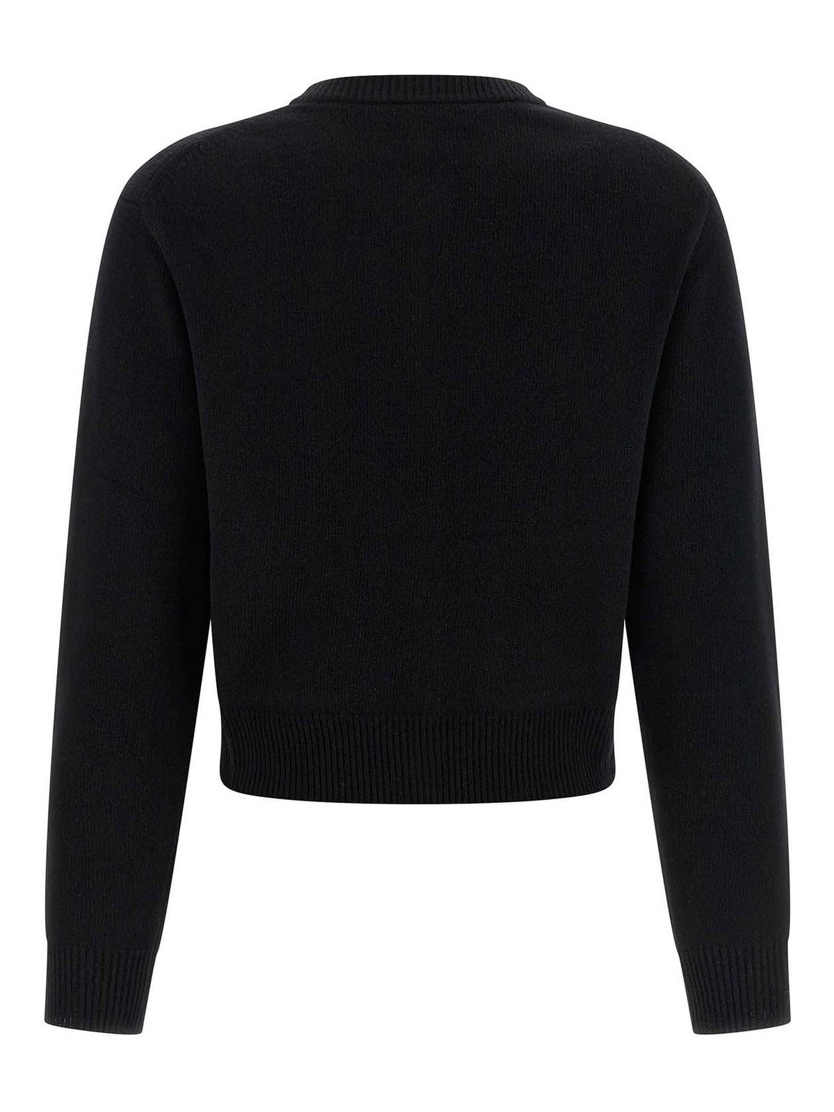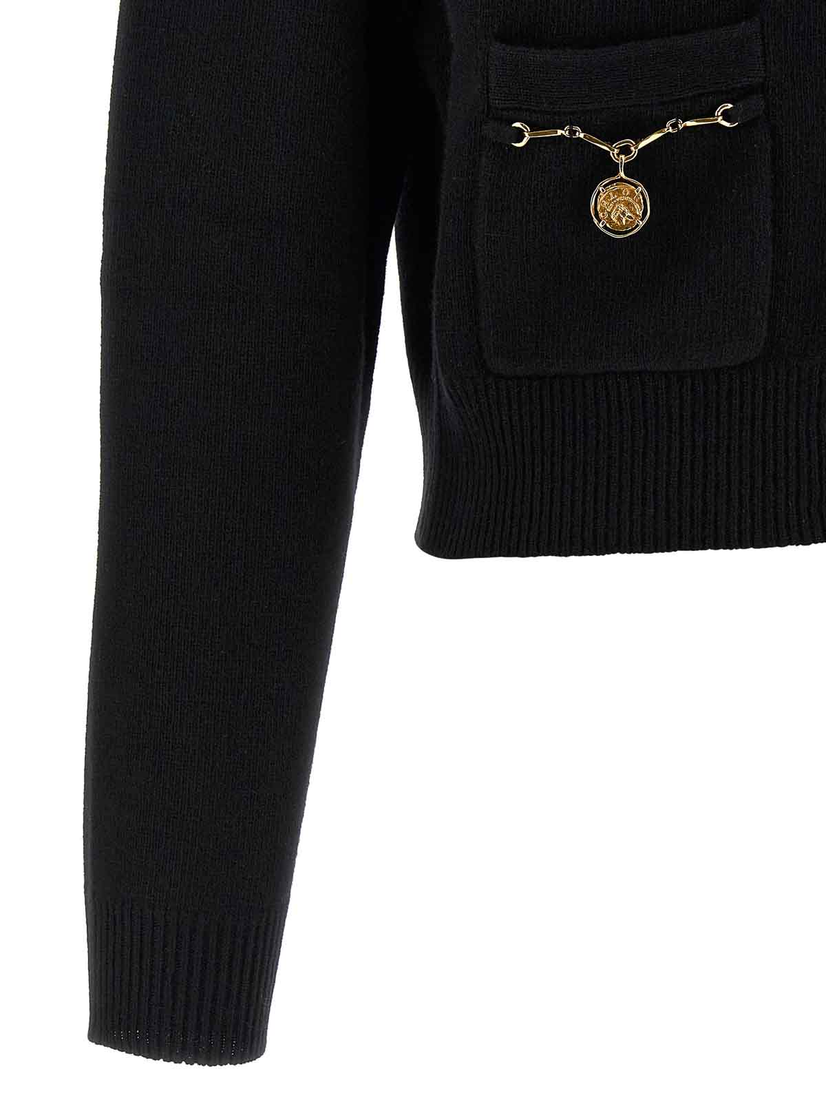 Cardigan in maglia di lana merino e cashmere, girocollo, taglio leggermente cropped, chiusura frontale con bottoni metallici 'medaglia cavallo', tasche con dettagli gioiello, maniche lunghe con polsino e spalla scesa.