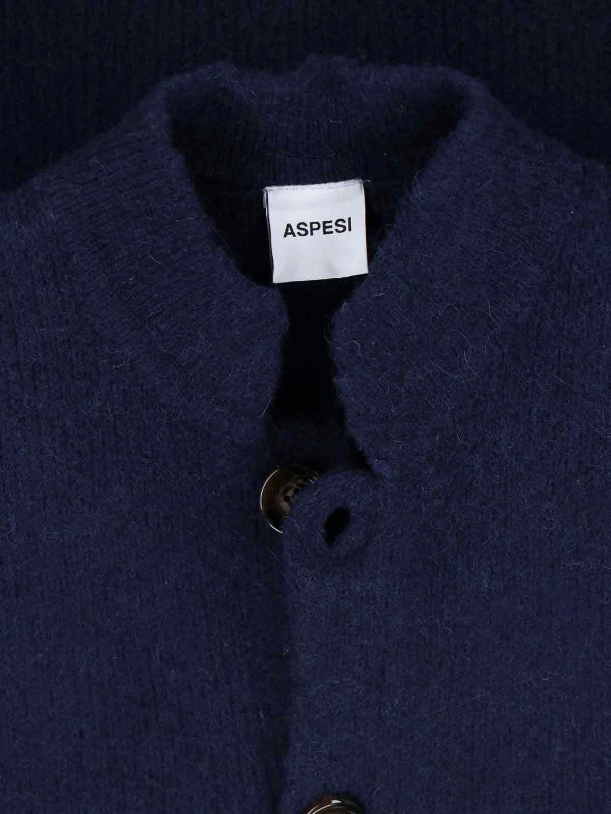Cardigan in lana aspesi, grigio, girocollo, chiusura bottoni, due tasche applicate fronte, orlo dritto.