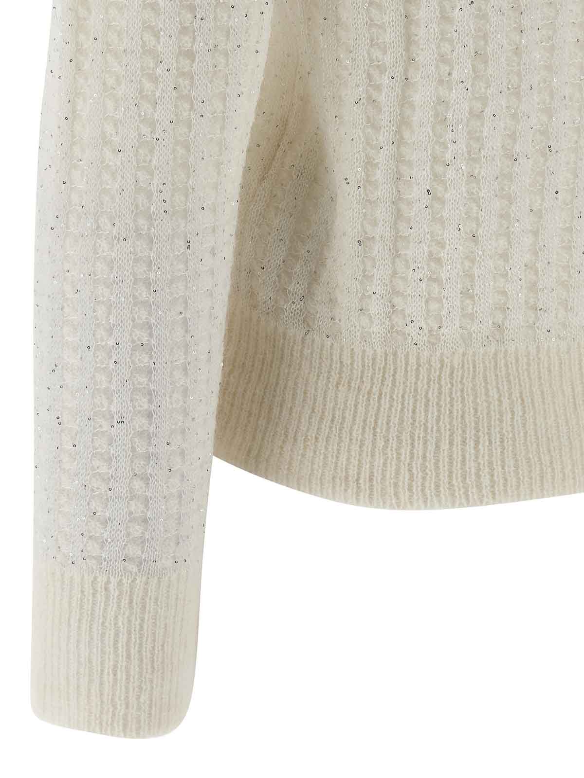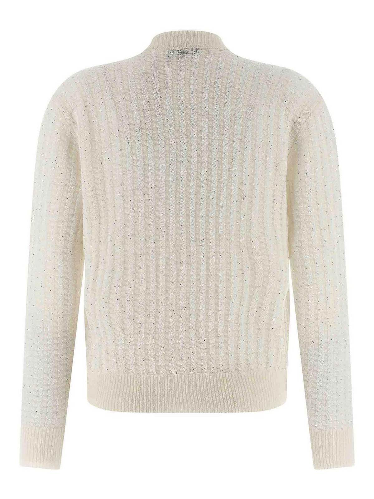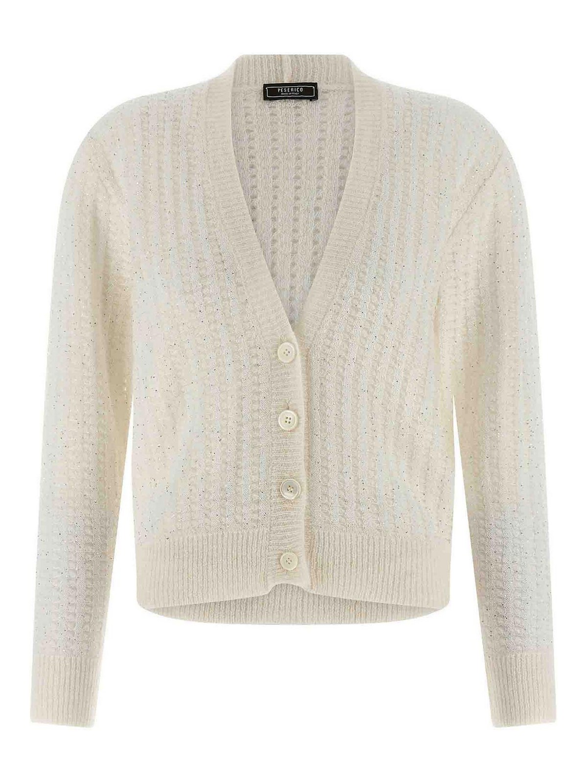 Cardigan tricot in filato di alpaca e lana con applicazioni di paillettes all over, scollo a V, chiusura frontale con bottoni, maniche lunghe con risvolto.