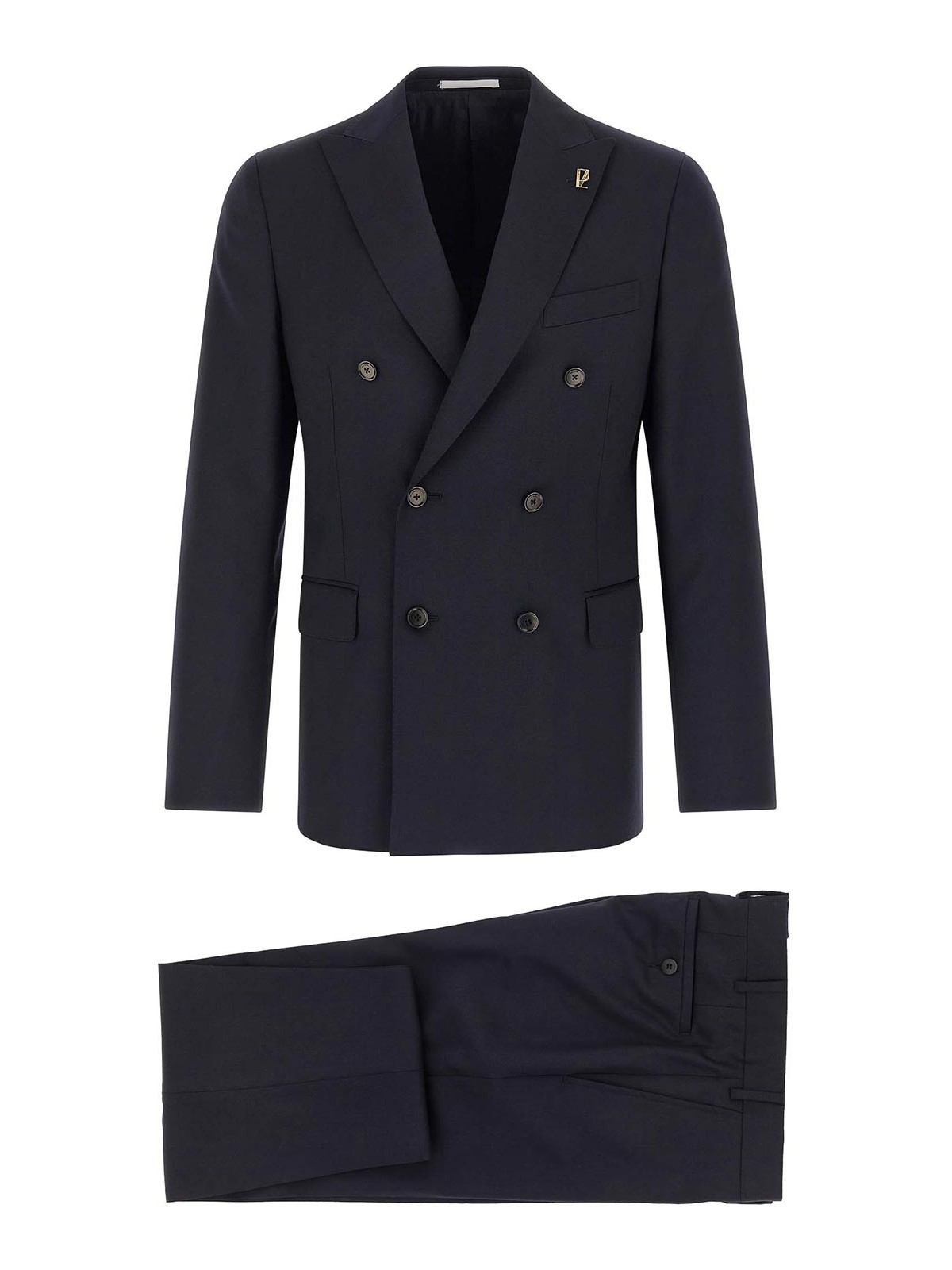 Vestito 'lord' in lana composto da giacca doppiopetto con chiusura frontale a bottoni, revers a lancia con spilla in metallo removibile, taschino sul petto, tasche con patta, fodera in cupro, due tasche interne, tracolla strutturata, polsini con bottoni, spacchi posteriori e pantalone con piega stirata, tasche anteriori 'americane', tasche posteriori a filetto, chiusura frontale con zip e bottone, fodera in viscosa.