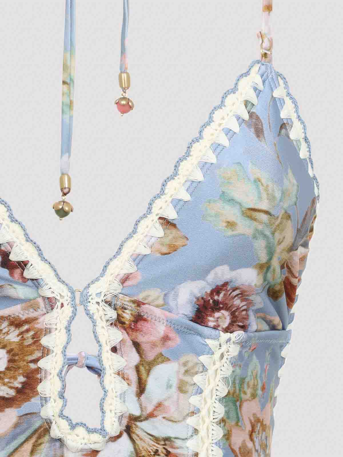 Zimmermann chambray blu risveglio all'uncinetto realizzato in misto poliammide ed elastan. spalline sottili regolabili, scollo a V anteriore, dettaglio buco della serratura anteriore, senza maniche, tracolla regolabile sul retro. fondo blu chambray, dettagli all'uncinetto bianco a contrasto, disegno di fiori multicolor.