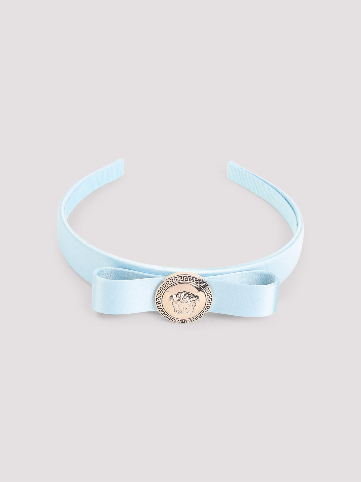 Cerchietto Versace blu pastello. realizzato in misto viscosa e seta. cerchietto in puro blu pastello, cinturino superiore tono su tono, dettaglio superiore grigio palladio metallizzato con abbellimento del caratteristico volto di medusa 3D.