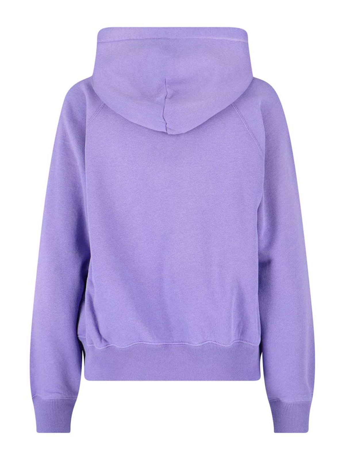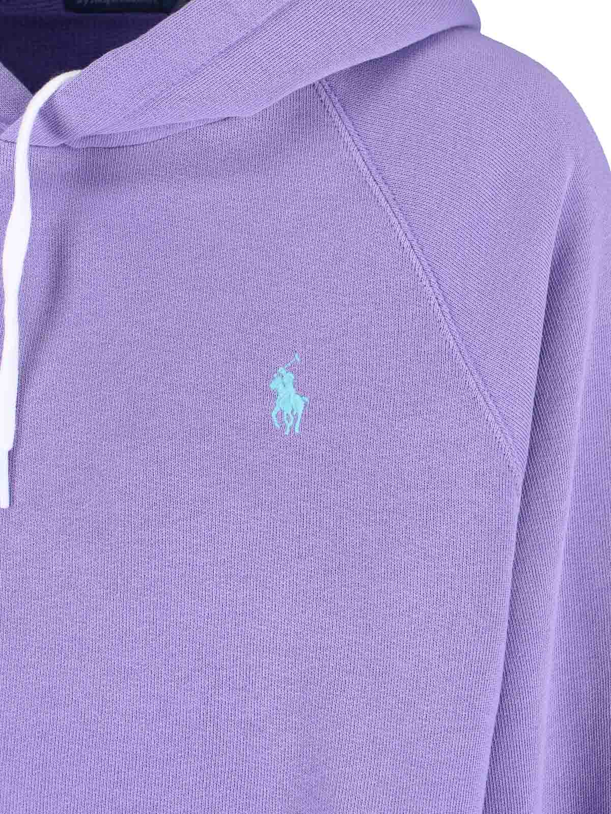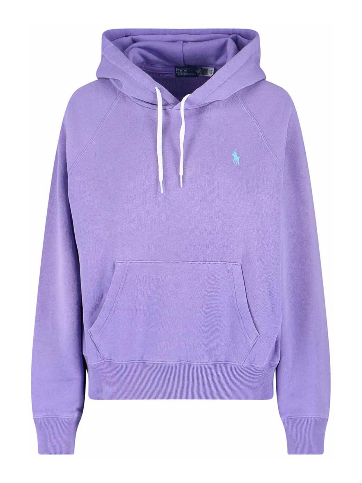 Felpa cappuccio logo polo ralph lauren, in misto cotone viola, cappuccio coulisse, ricamo logo azzurro petto, una maxi tasca fronte, finiture a costine, orlo dritto.