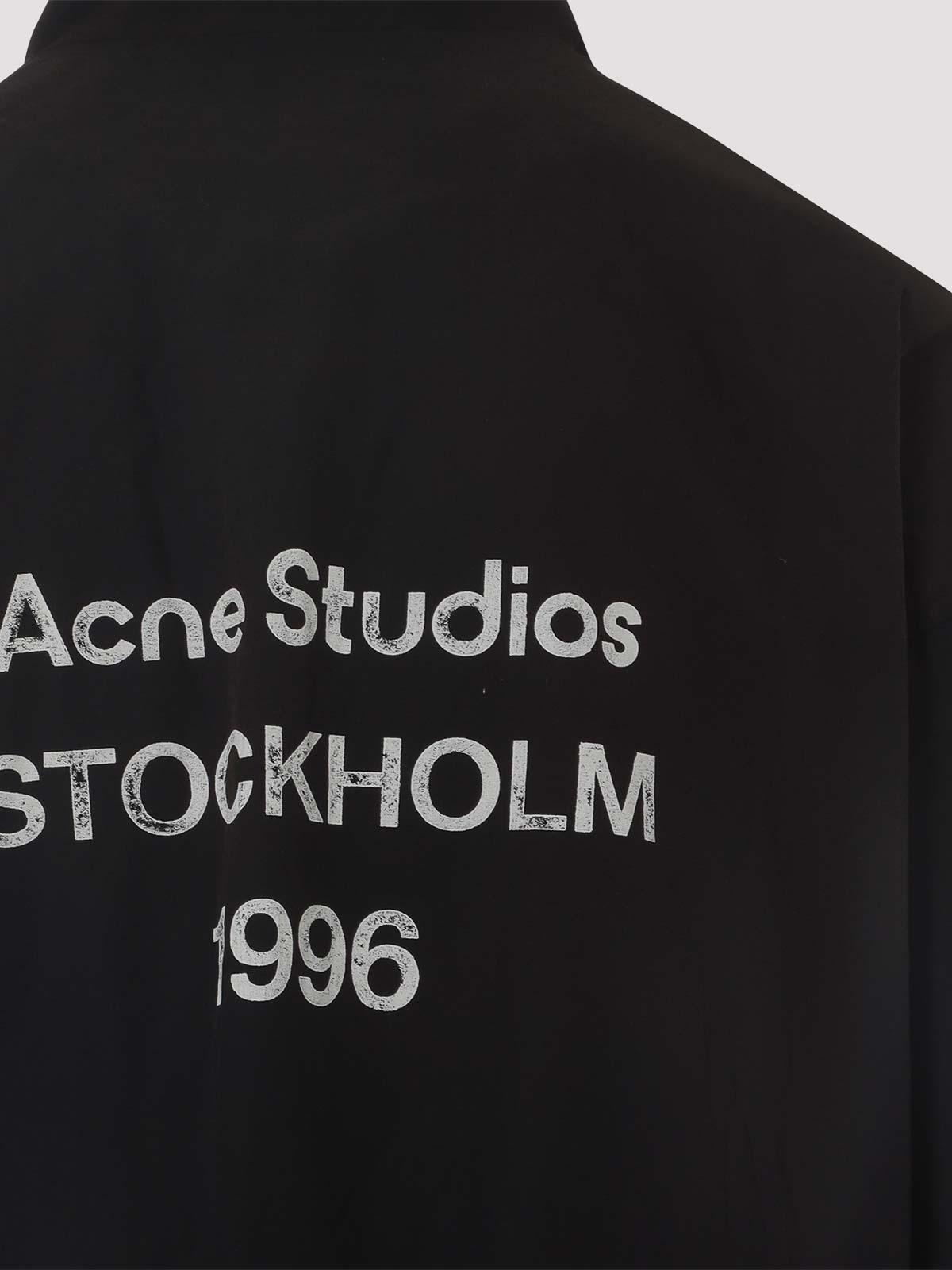 Giacca in cotone nero di Acne Studios. Giubbotto in puro cotone nero, collo in piedi, chiusura frontale con zip, logo lettering bianco a contrasto sul petto, tasche laterali, logo lettering bianco a contrasto sul retro, maniche lunghe, polsi e fondo elasticizzati, fondo dritto.