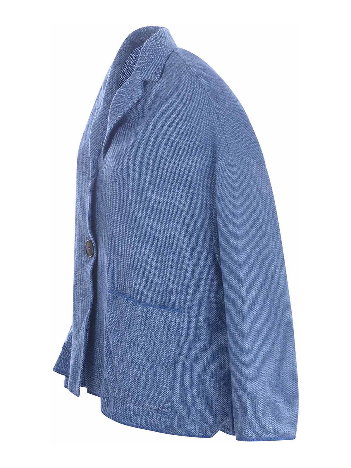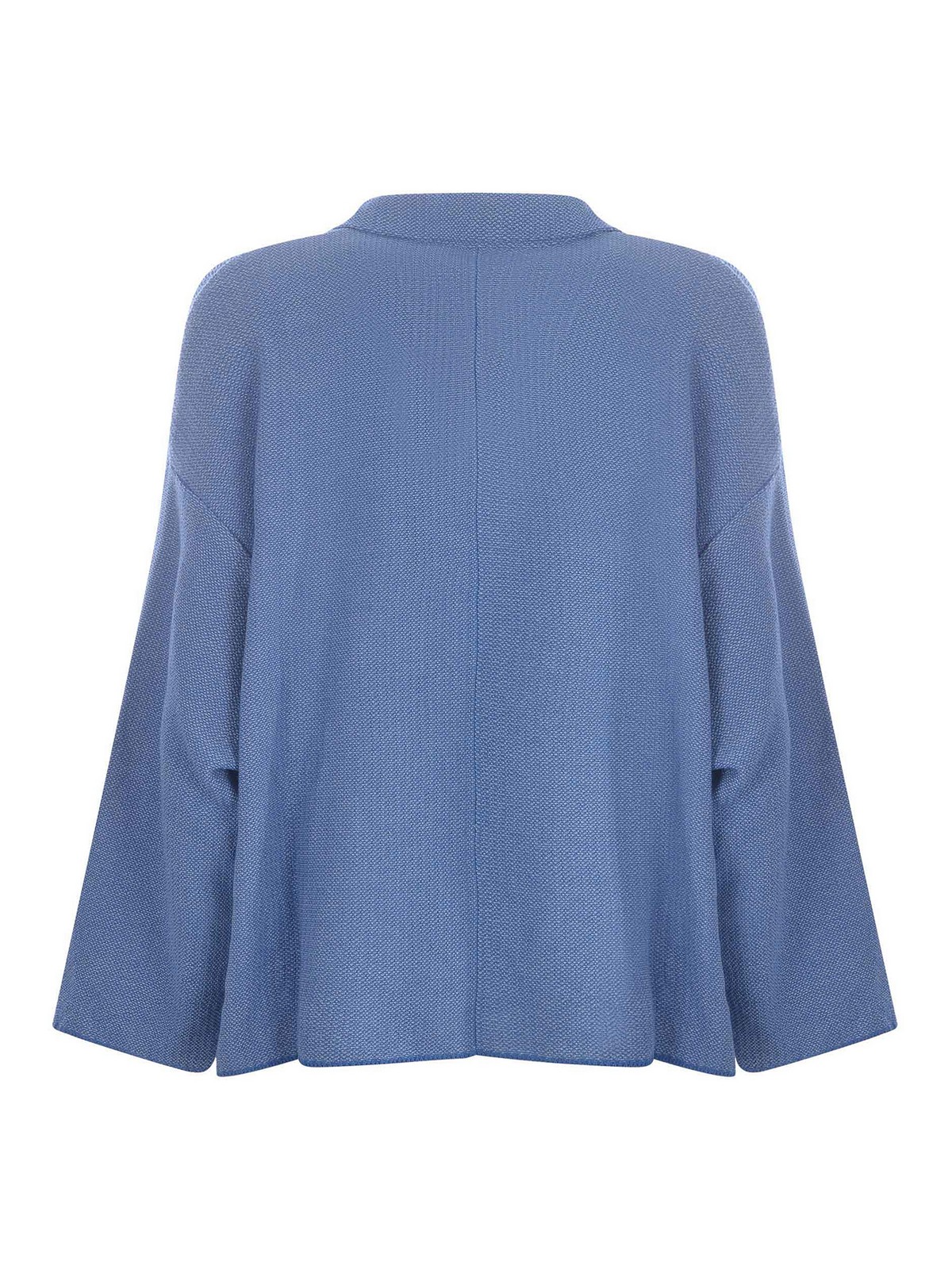 Giacca base milano in cotone azzurro collo con riverenza maniche 3/4 chiusura con due bottoni tasche laterali a toppa 100% cotone