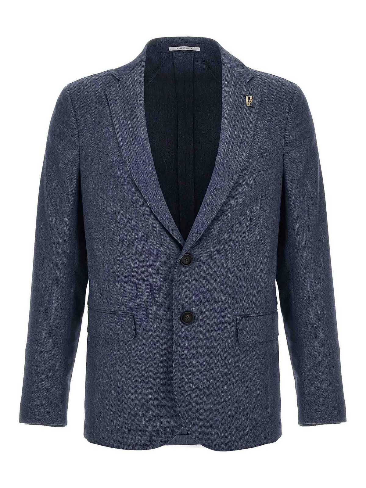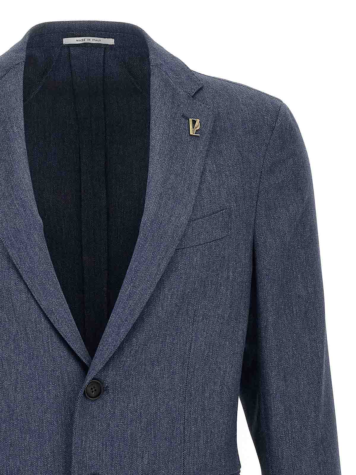 Giacca monopetto 'brera' in lana spigata con chiusura frontale con bottoni, revers a lancia con spilla in metallo removibile, taschino sul petto, tasche applicate, due tasche interne, polsi con asole apribili, spacchi posteriori.