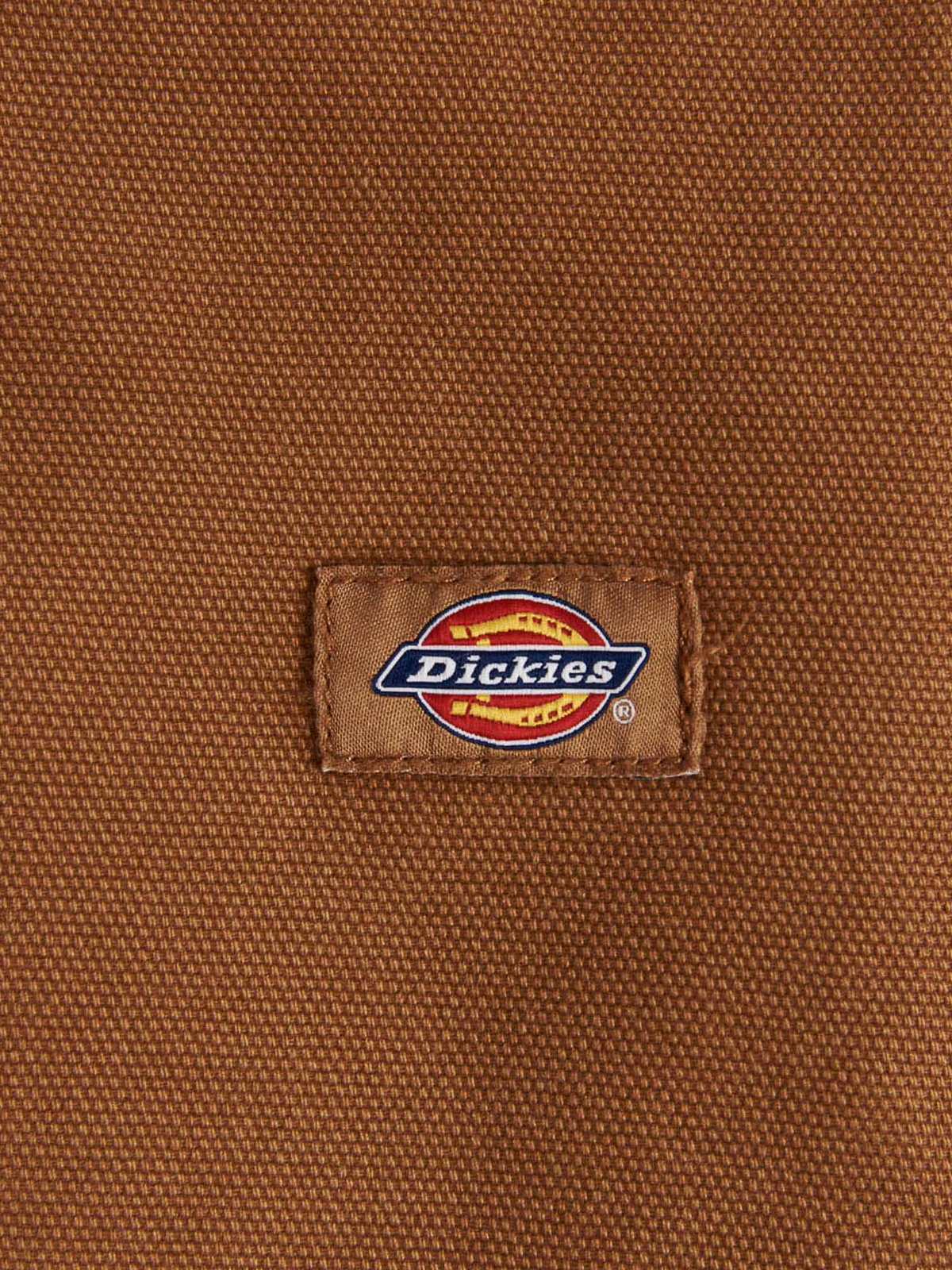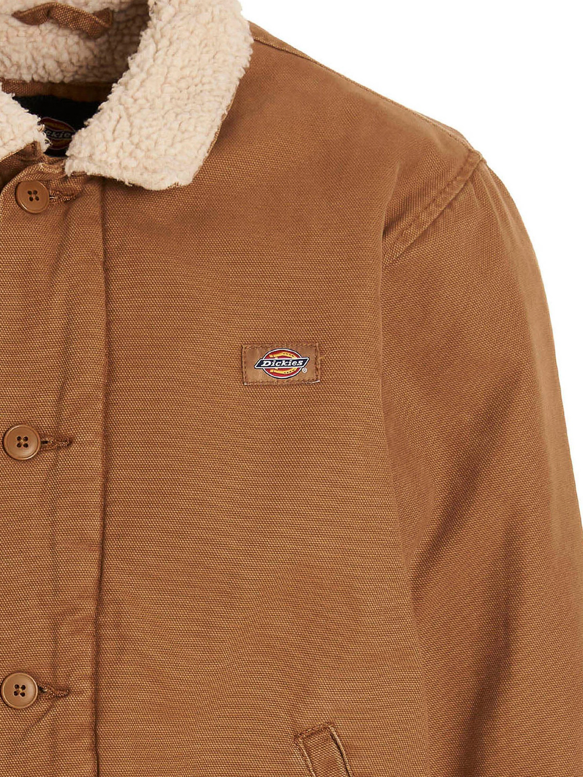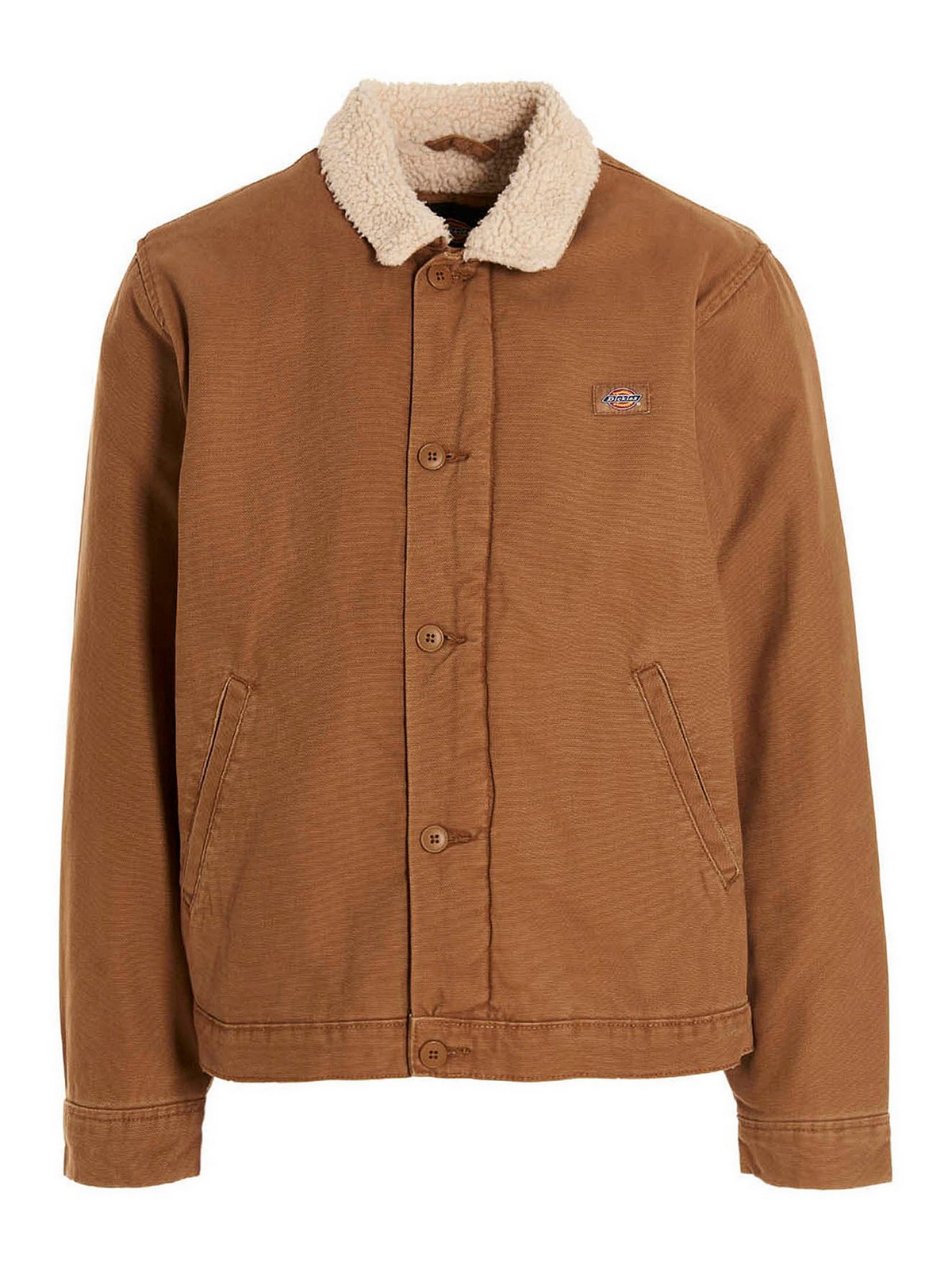 Giubbotto in tela con fodera in peluche, modello monopetto con chiusura a bottoni e patch logo.