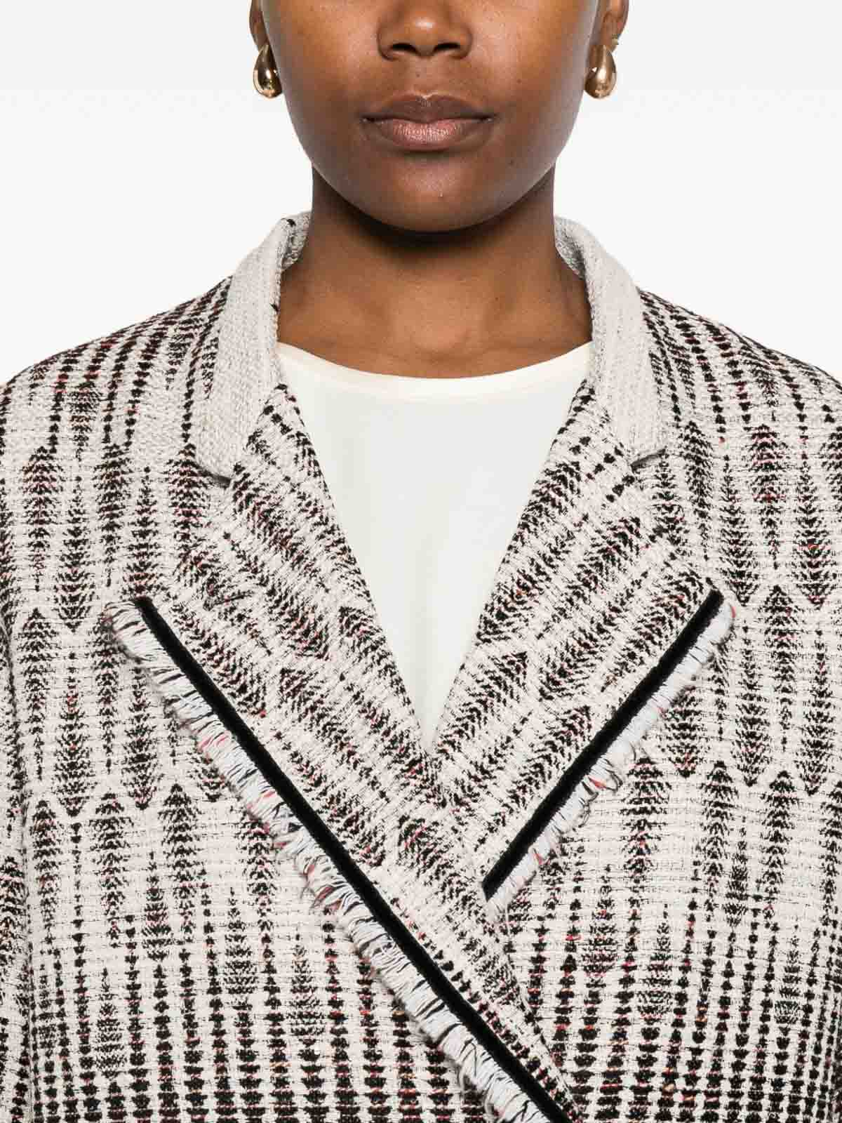 Finiture sfrangiate con chiusura a bottoni doppiopetto con motivo geometrico color crema