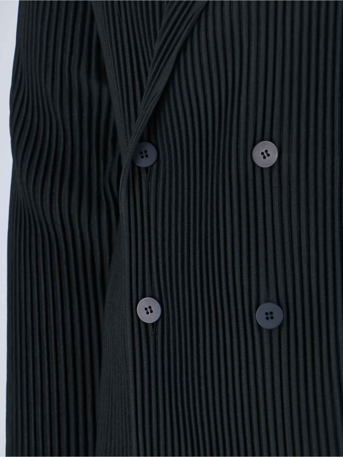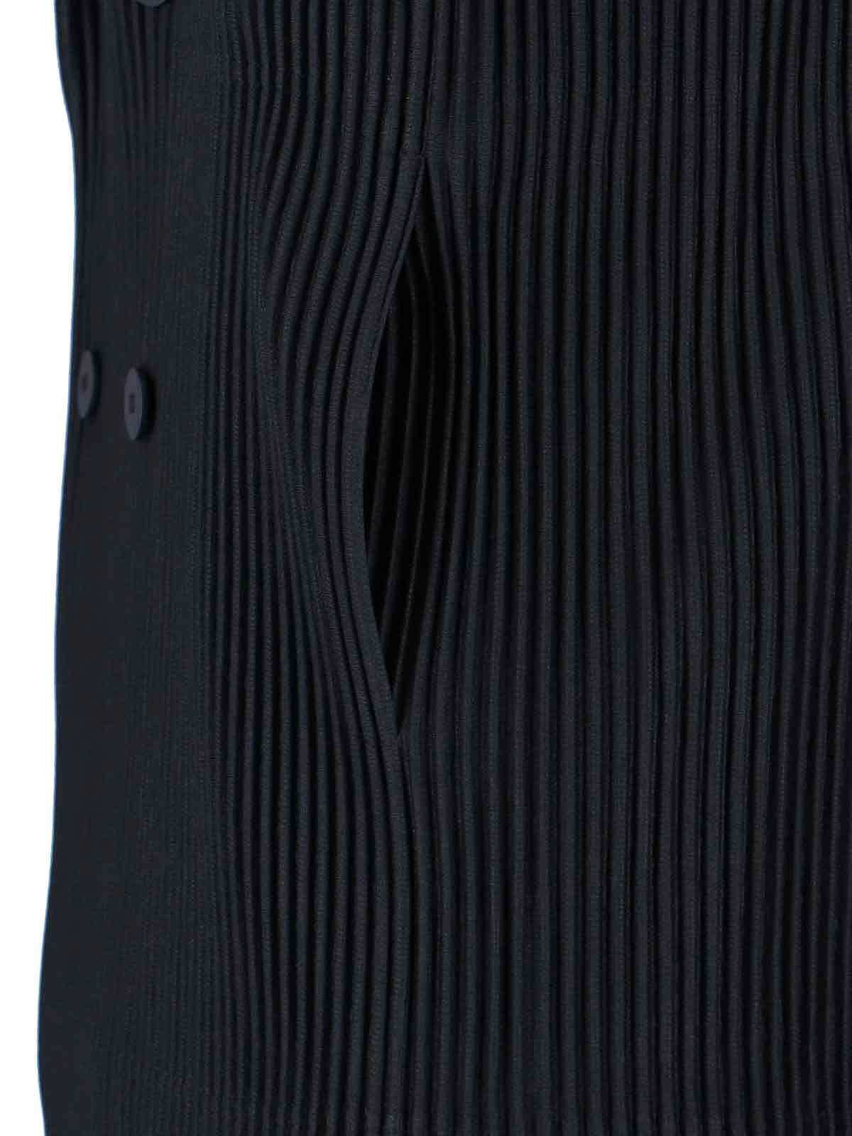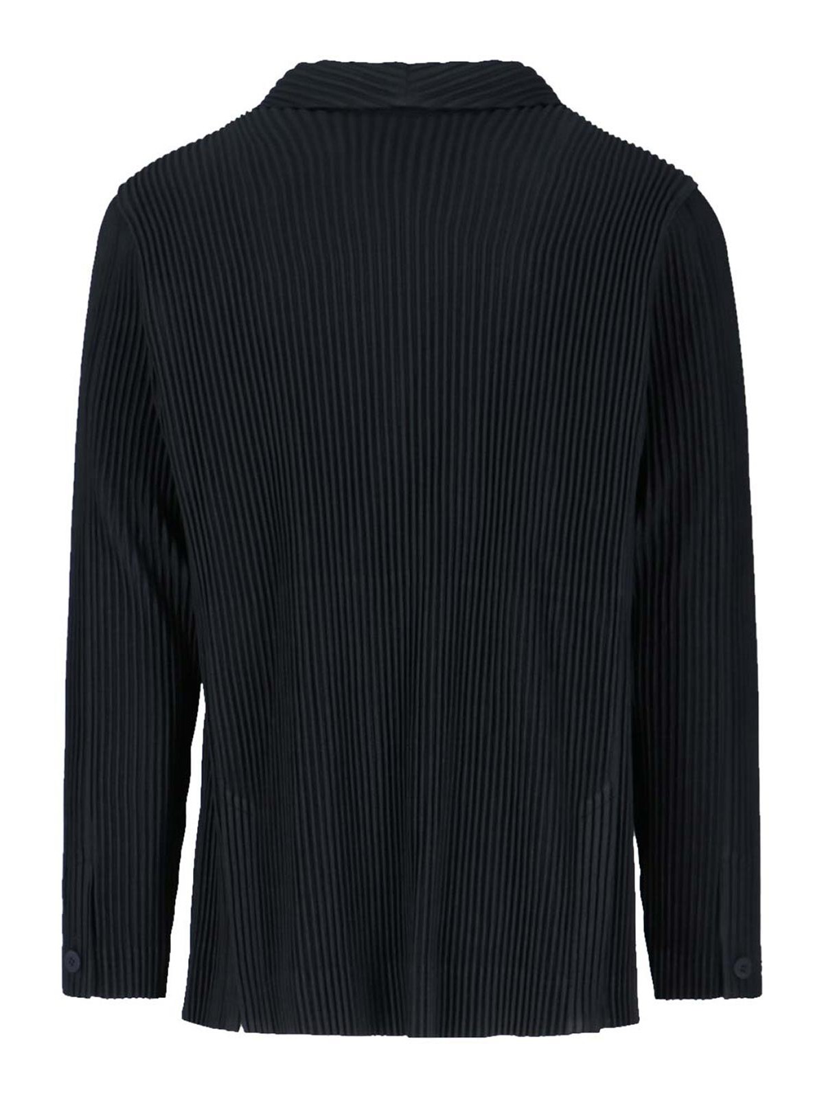 Blazer doppiopetto homme plisse, in tessuto plissettato nero, revers classico, chiusura bottoni, due tasche laterali, bottoni polsini, orlo dritto.