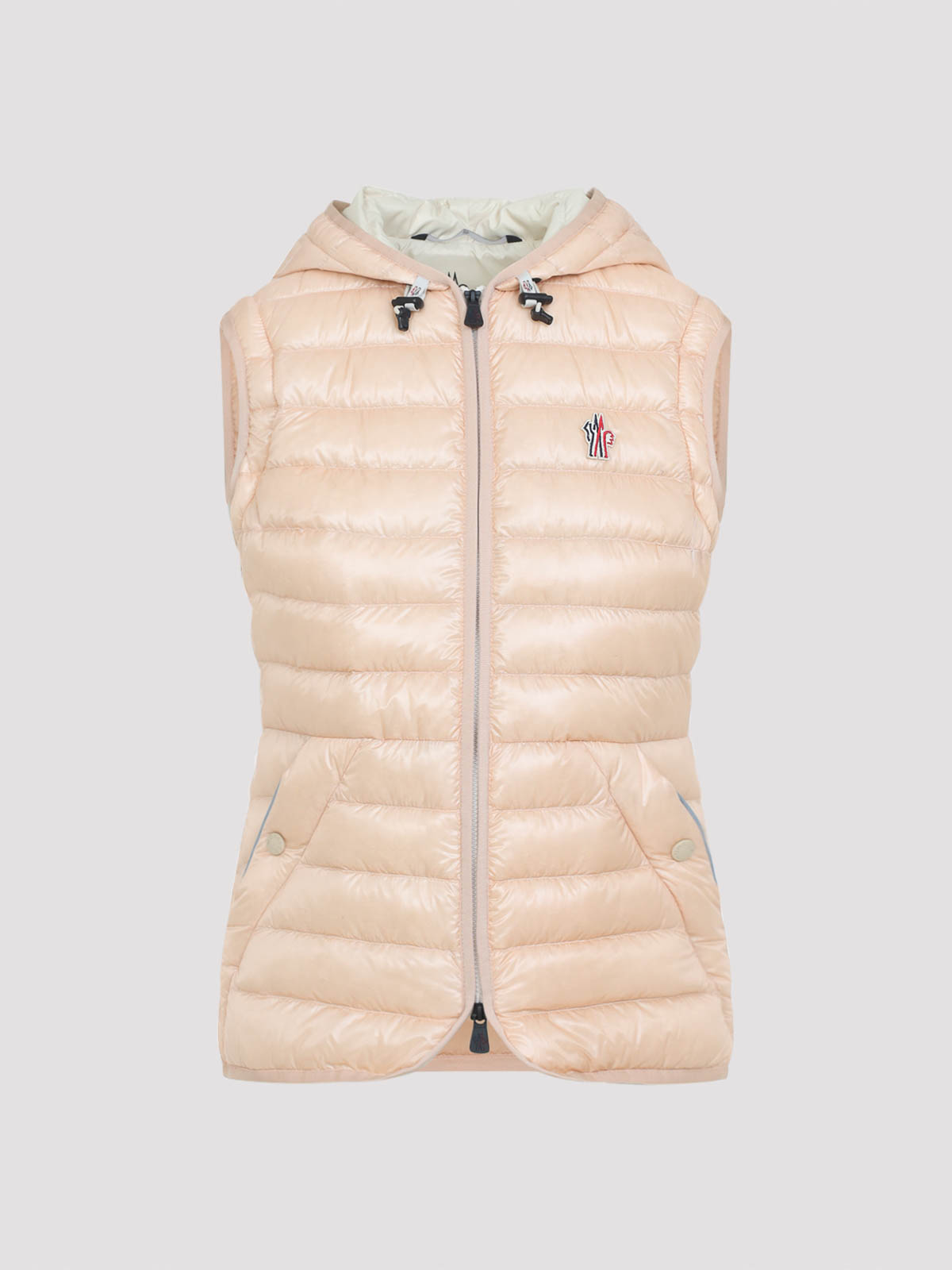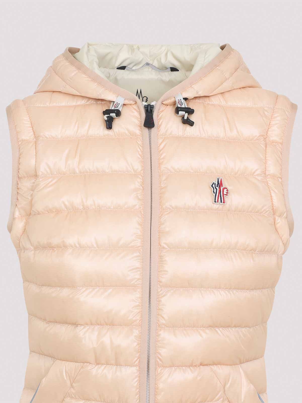 Giubbotto Moncler grenoble karuras rosa in poliammide. realizzato in micro ripstop rosa, caratterizzato da motivo trapuntato, imbottito in piuma, cappuccio con coulisse, chiusura con zip a doppio cursore, logo sul petto, maniche lunghe staccabili, polsini regolabili, tasche frontali con bottoni, dettagli riflettenti e bordi elasticizzati.