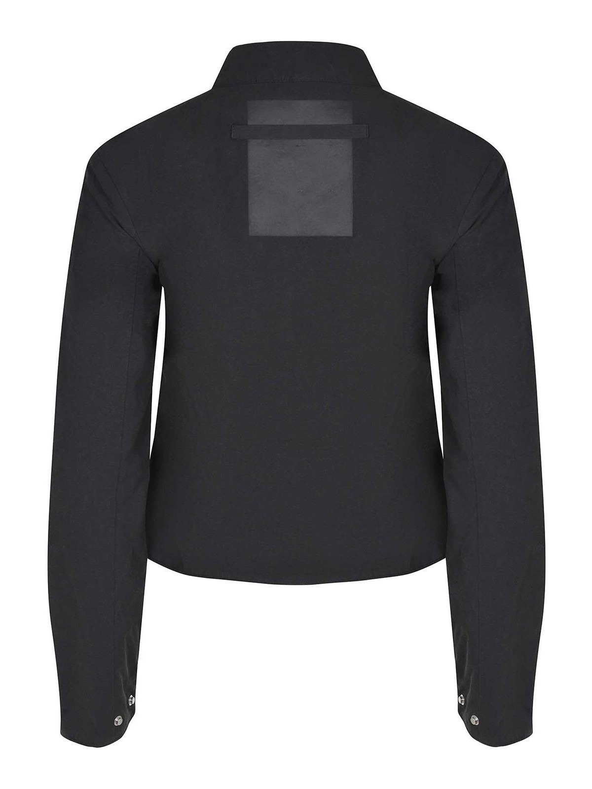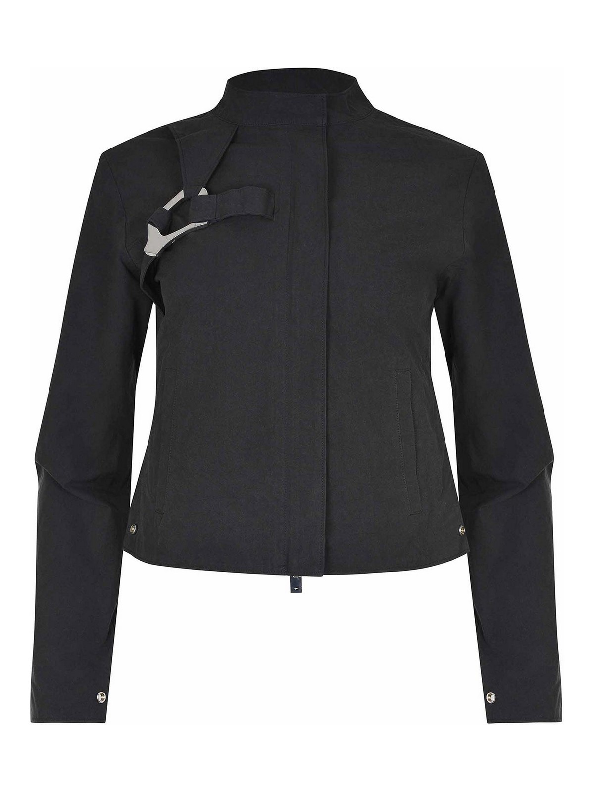 Giacca Heliot emil realizzata in cotone nero, colletto, chiusura frontale con due bottoni e cerniera, maniche lunghe. polsini con bottoni, dettaglio astratto in metallo argentato sul petto, tasche laterali, patch in pelle tono su tono sul retro con logo, 100% cotone