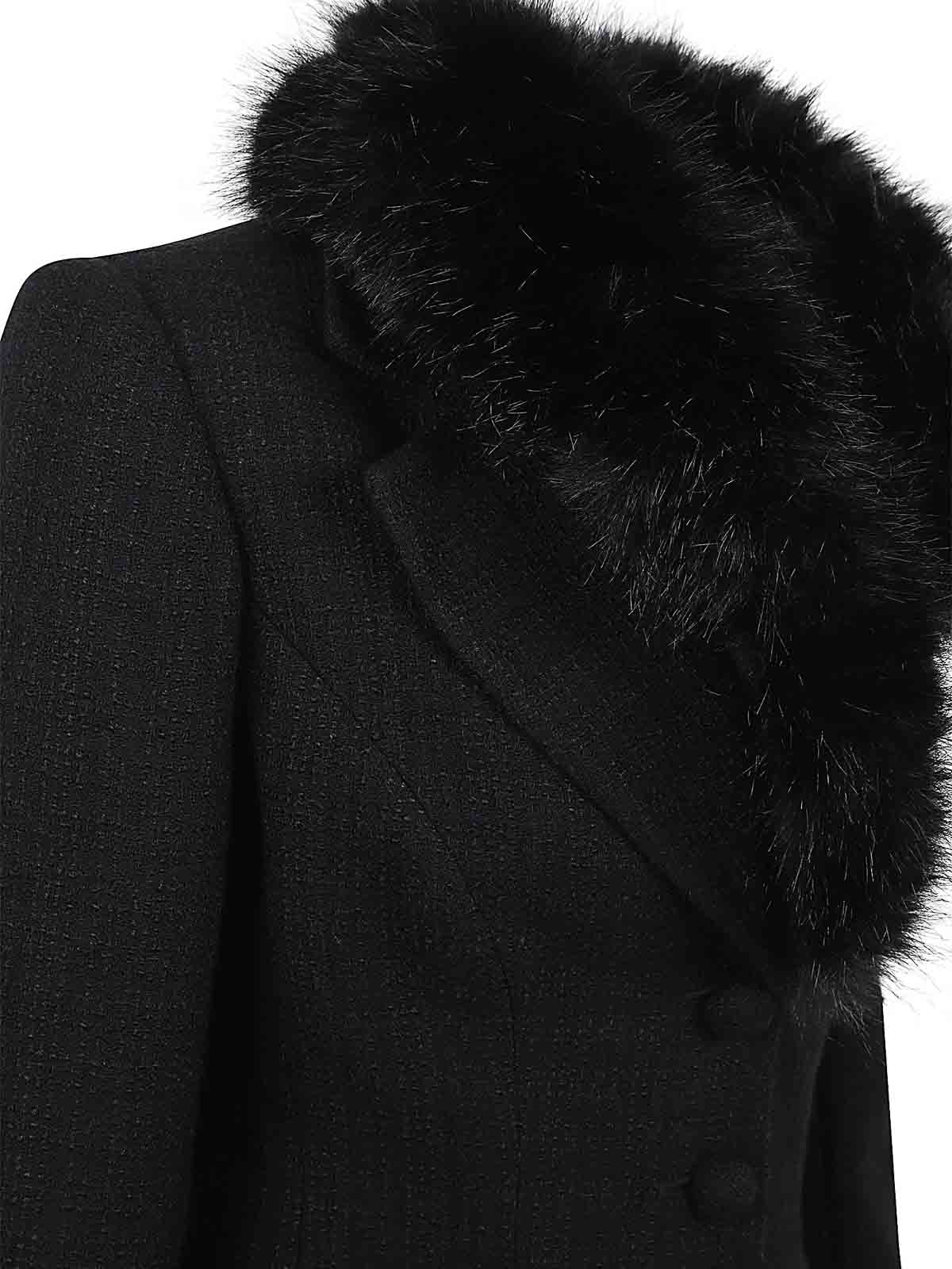 Nero, texture in tweed, collare in pelliccia sintetica, polsini in pelliccia sintetica, chiusura con bottone