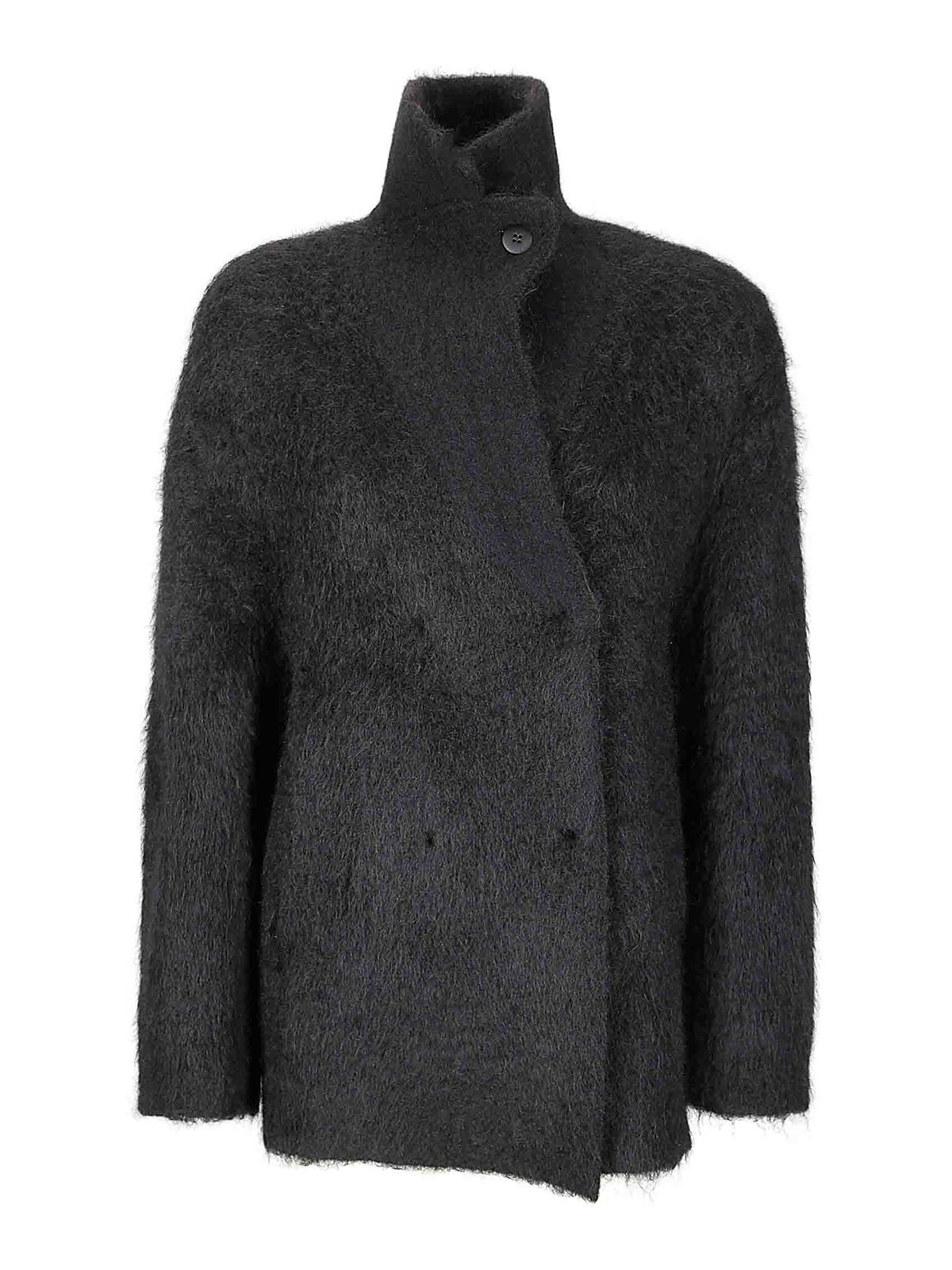 Giacca con chiusura doppiopetto con bottoni, due tasche a filetto laterali, design lavorato a maglia.