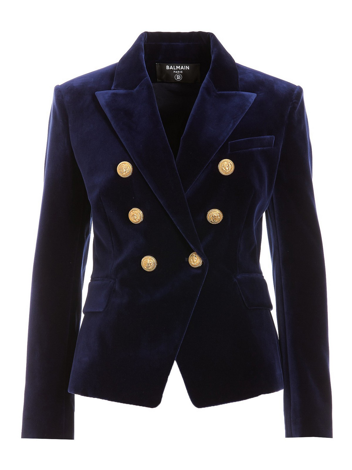 Giacca in velluto, chiusura doppiopetto, bottoni dorati frontali, bottoni dorati sui polsini, effetto velluto, tasche