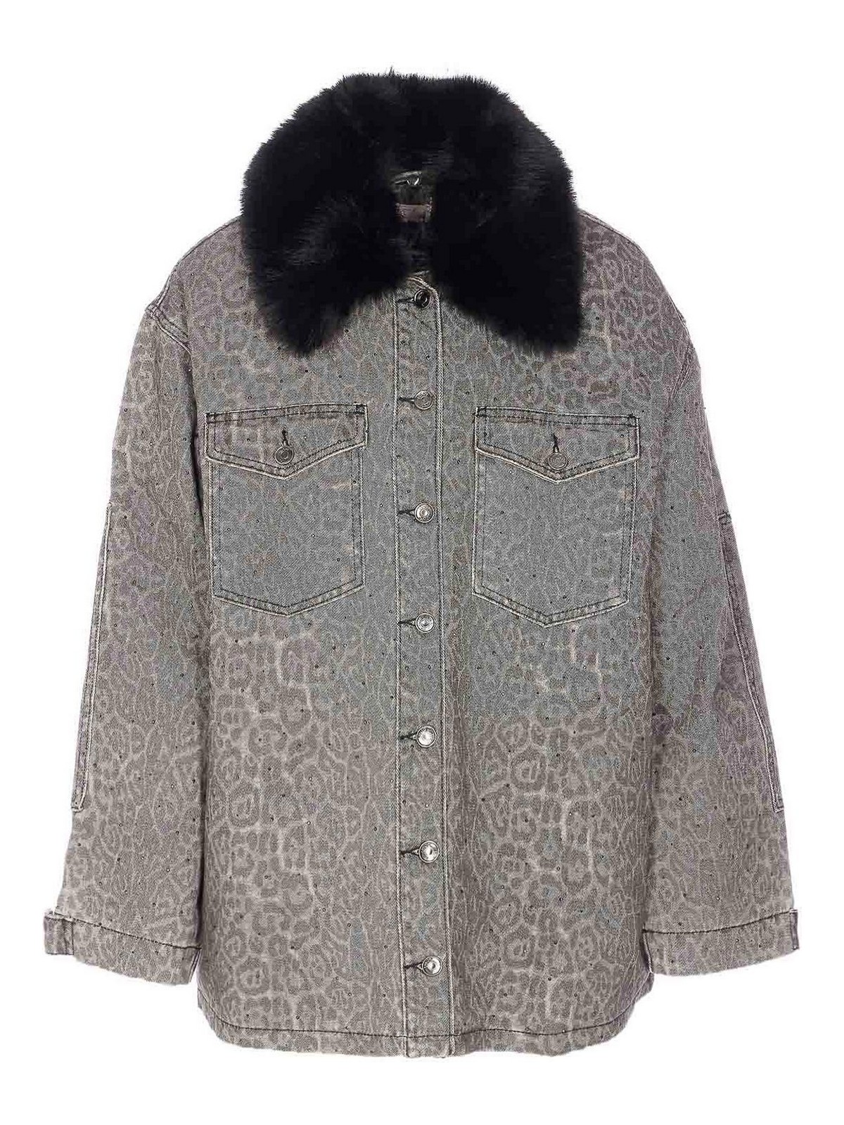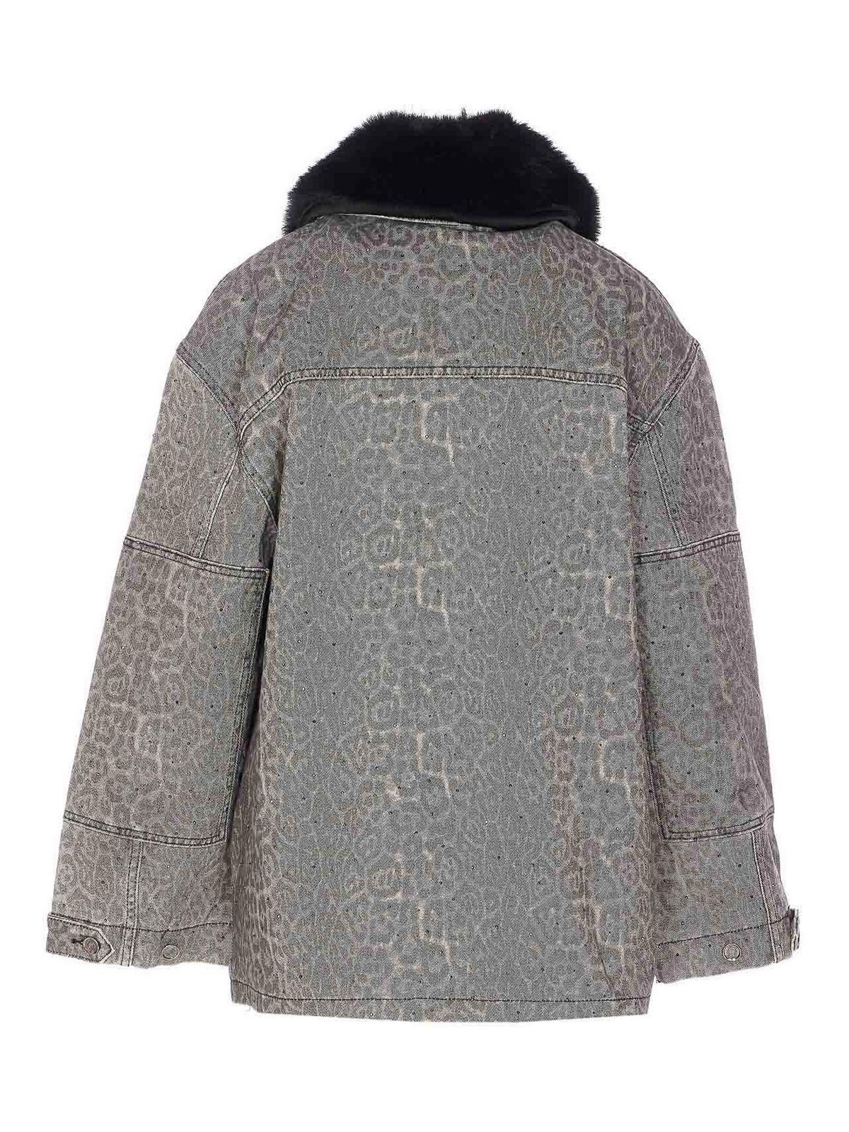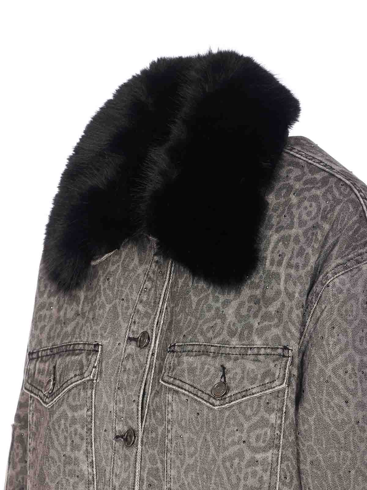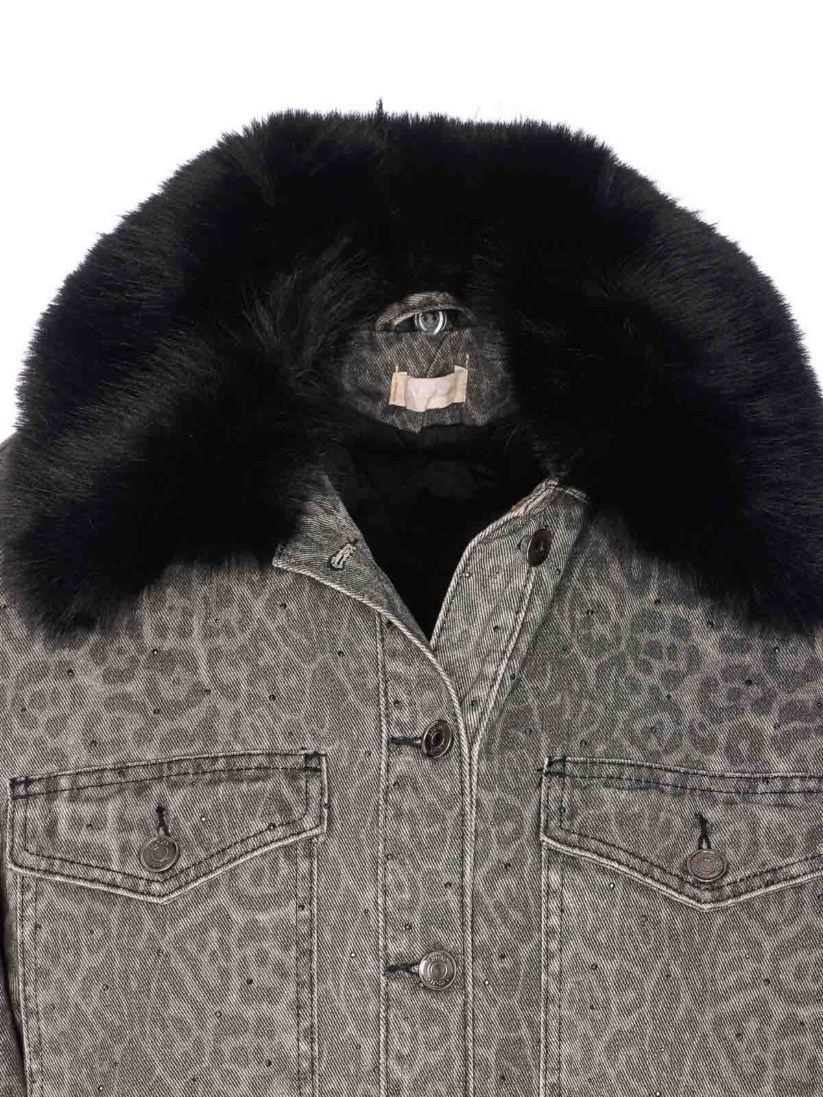 Giubbotto Liu jo in denim stampa grigio con chiusura con bottoni frontali, dettaglio in ecopelliccia removibile, maniche lunghe, tasche laterali, maniche lunghe, strass all over