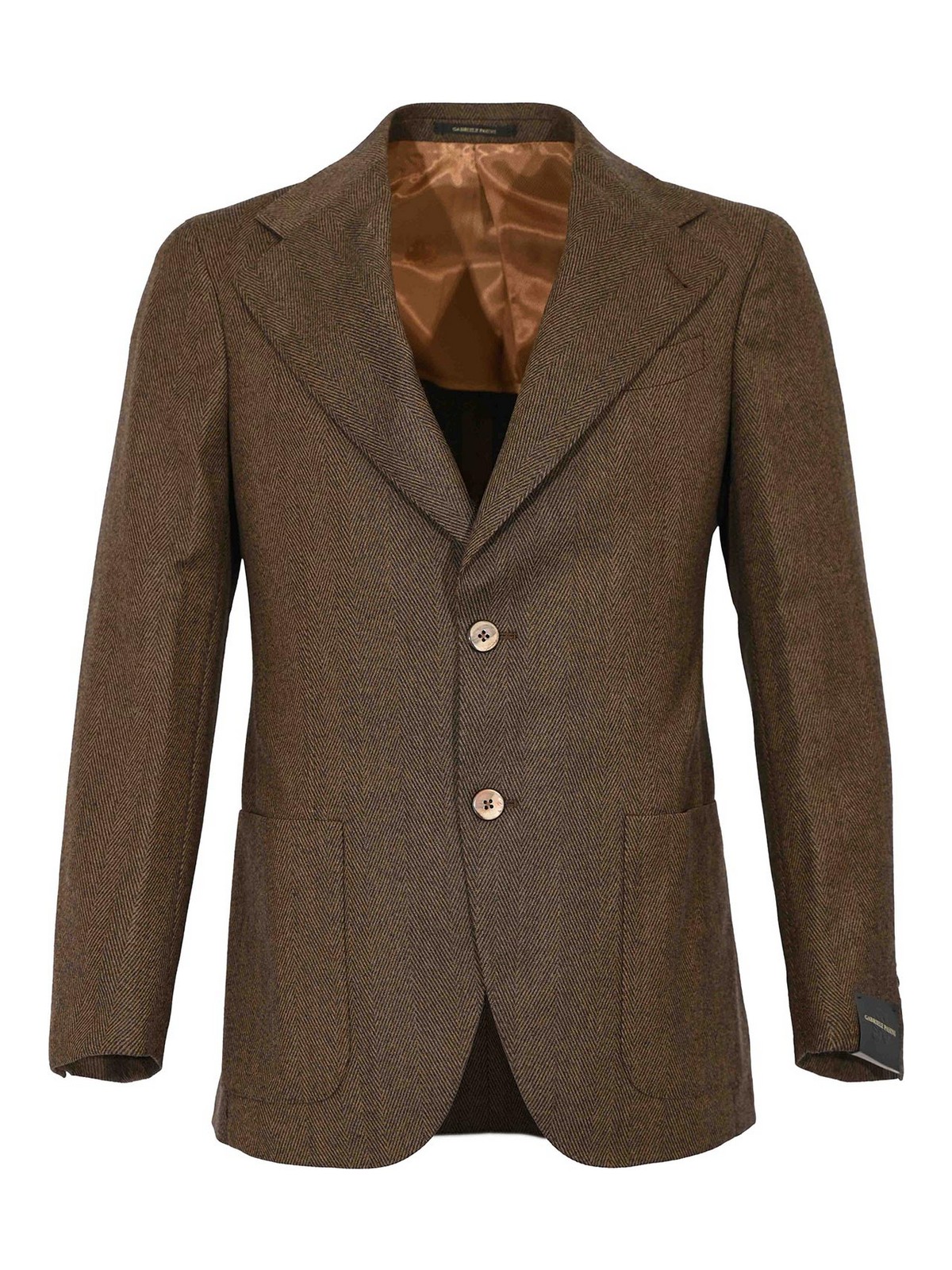 Giacca monopetto gabriele pasini fantasia spina di pesce fine nei toni del marrone maniche lunghe con bottoni ai polsi colletto ampio rever classico a lancia con due tasche con bottoni due tasche applicate e un taschino sul petto spacchi posteriori, costruzione sartoriale colorata con spalle strutturate e vestibilità moderna foderata sì vestibilità regolare