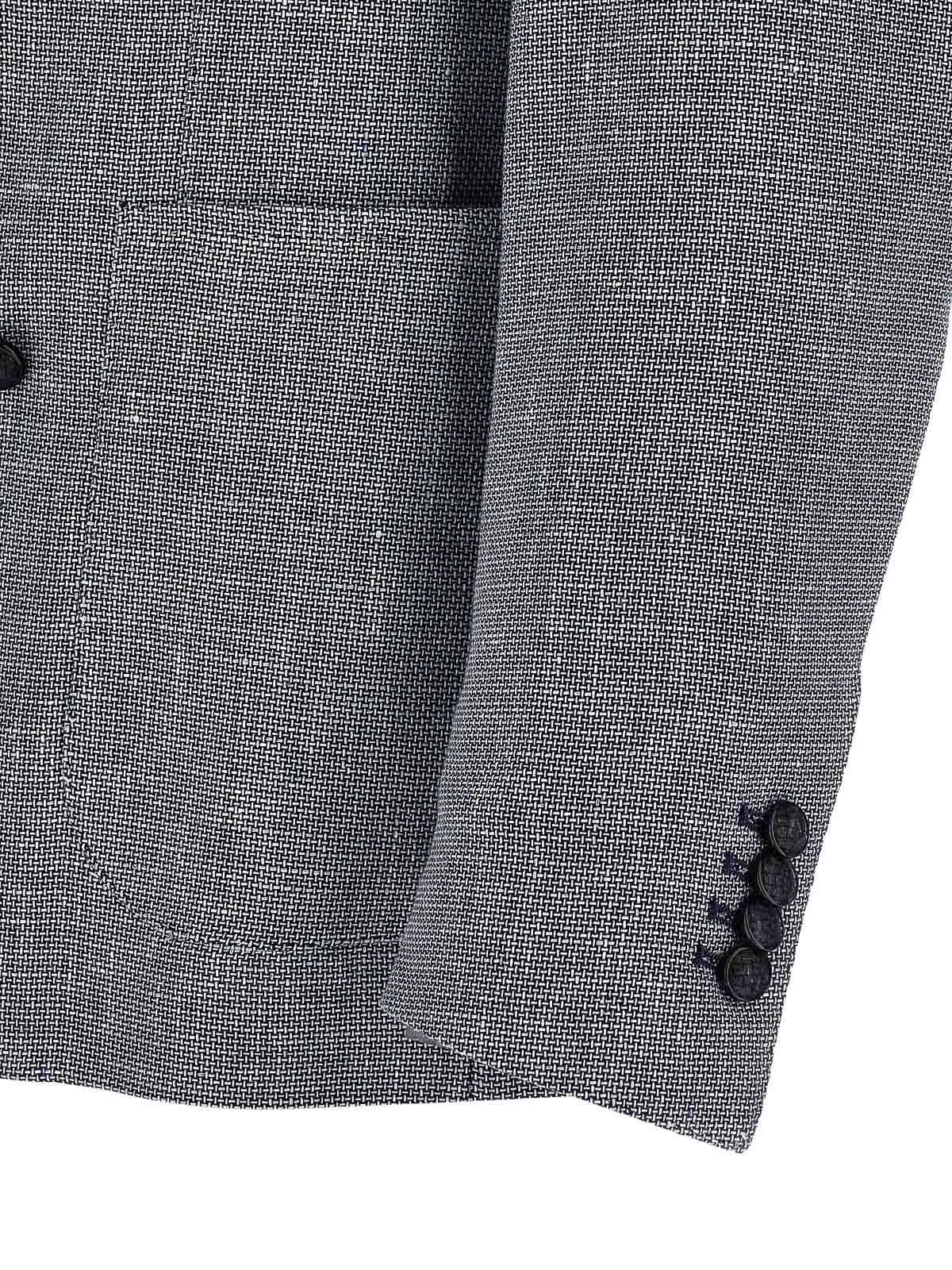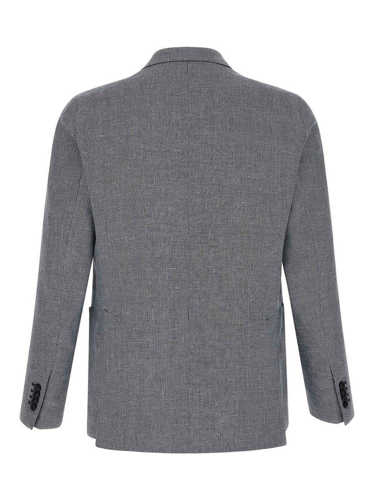 Giacca monopetto 'montecarlo' in misto lino e cotone con chiusura frontale con bottoni, revers a lancia con spilla in metallo removibile, taschino sul petto, tasche a toppa, sfoderato, tre tasche interne, polsini con asole aperte, spacchi posteriori.