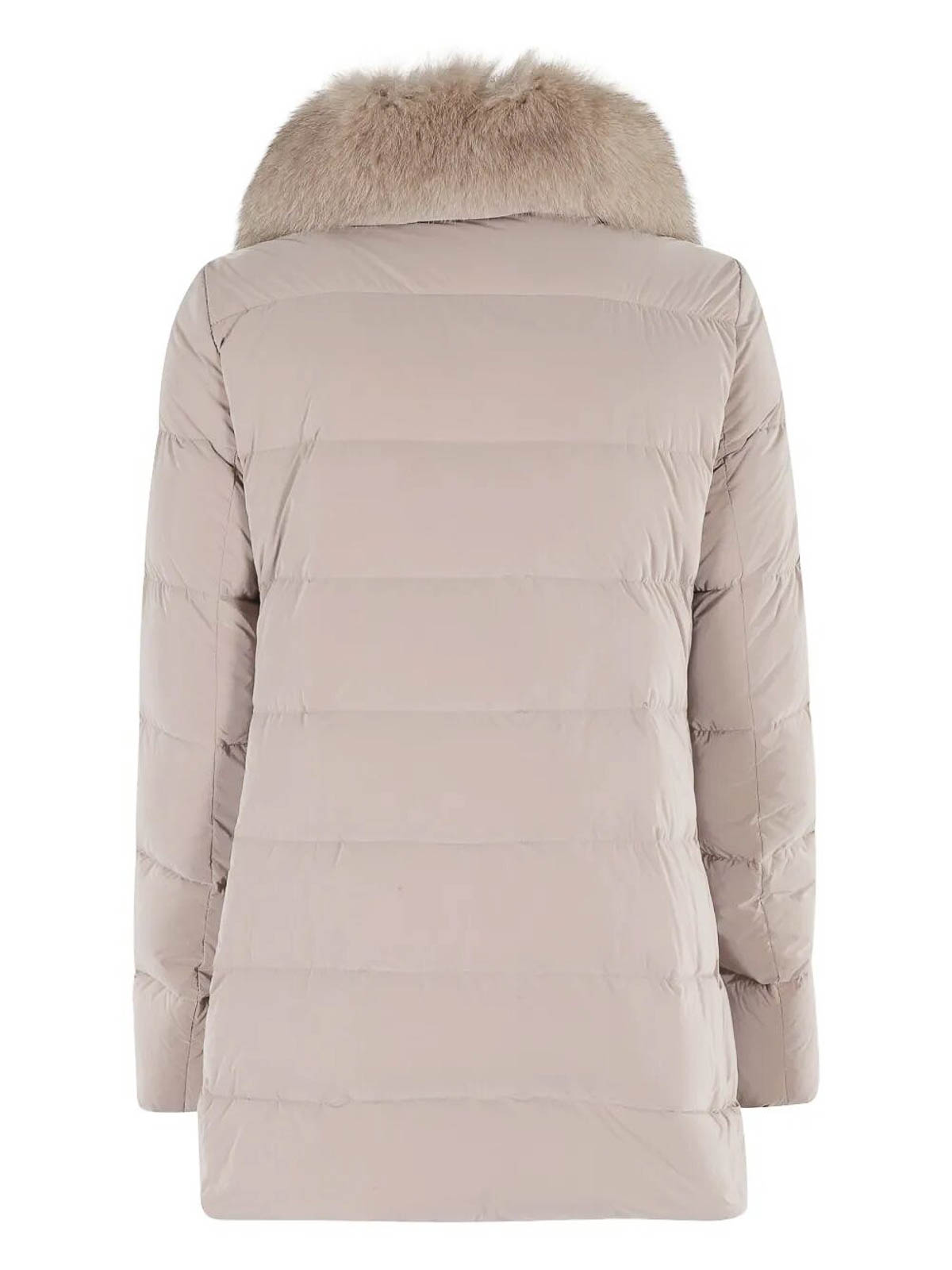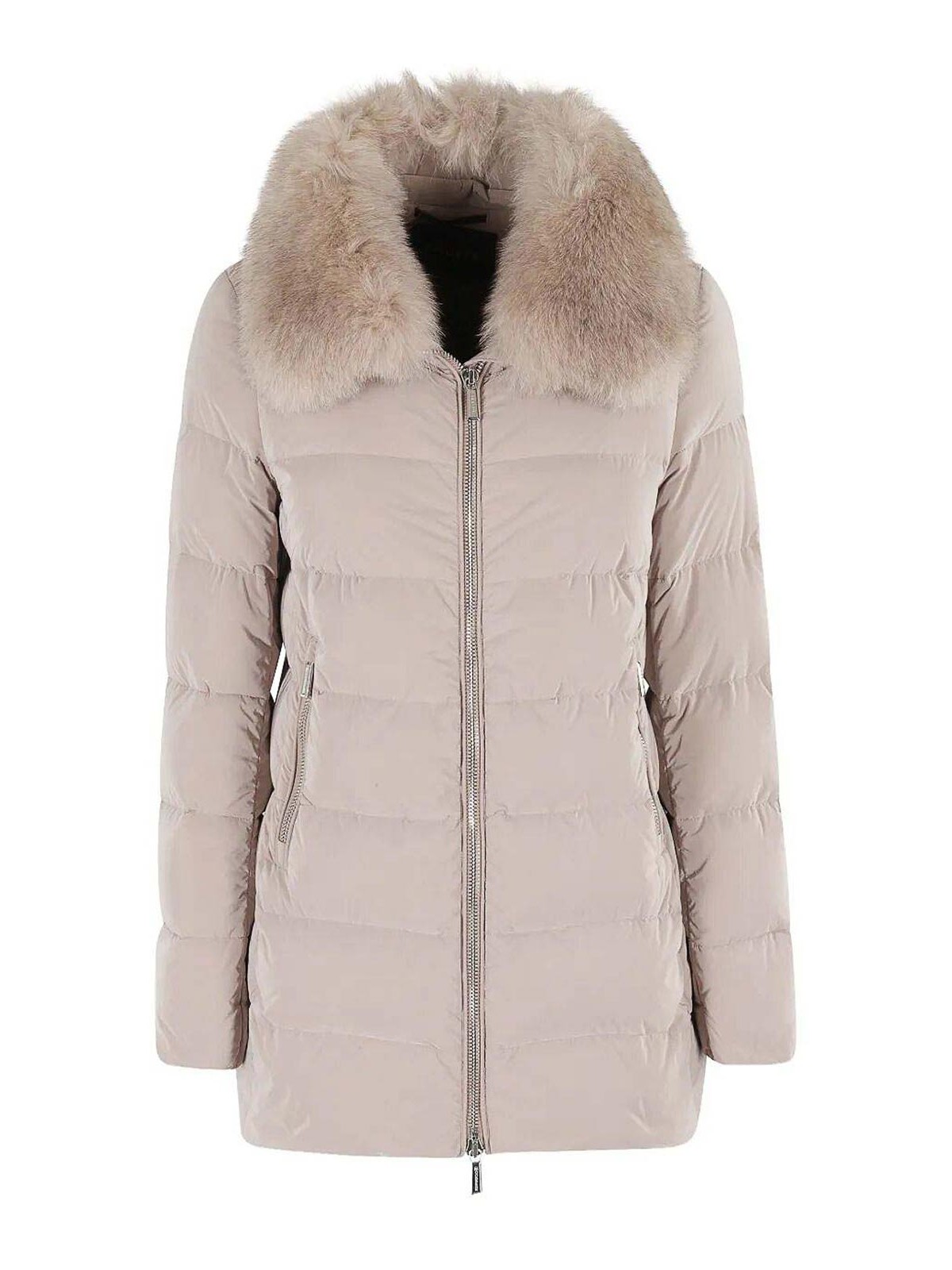 Collo in pelliccia marrone chiaro trapuntato, chiusura con zip, maniche lunghe, orlo dritto