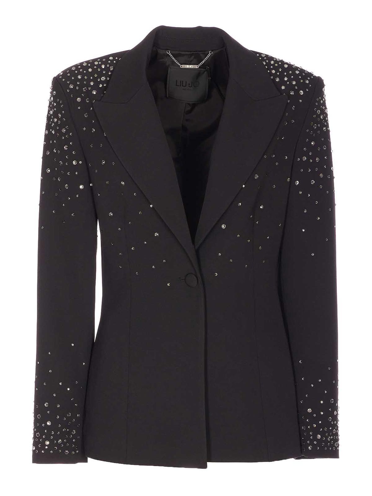 Giubbotto Liu jo nero con applicazione dettagli cristalli, spalla rinforzata, maniche lunghe, scollo a V, chiusura con bottoni sul davanti