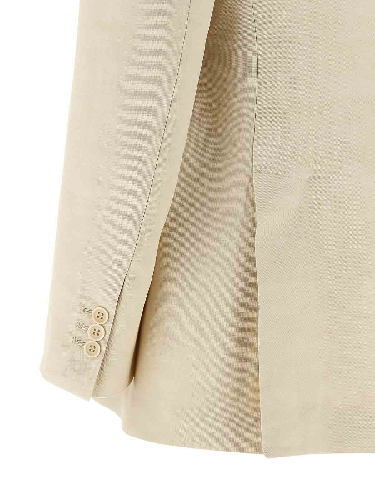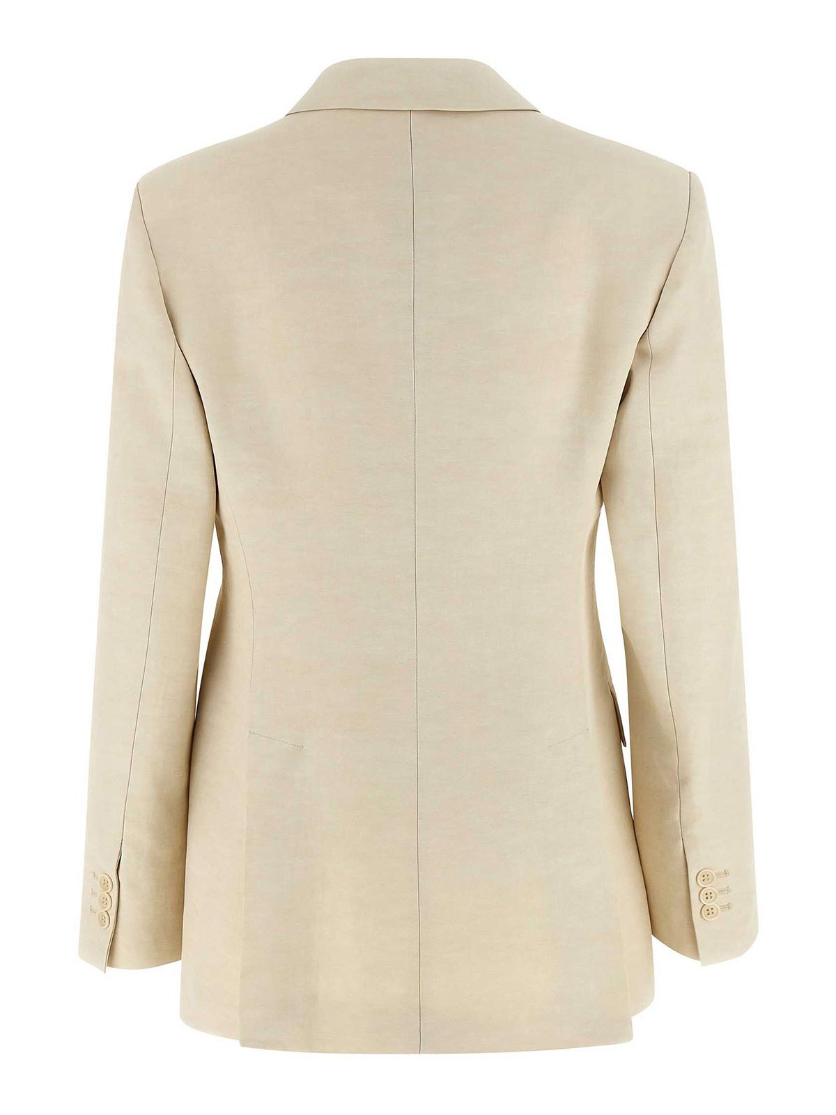 Giacca 'raisa' doppiopetto in misto lino con chiusura frontale con bottoni, scollo a V con revers, spalle leggermente imbottite, tasche frontali, maniche lunghe con bottoni ed elastico interno nascosto al polso.
