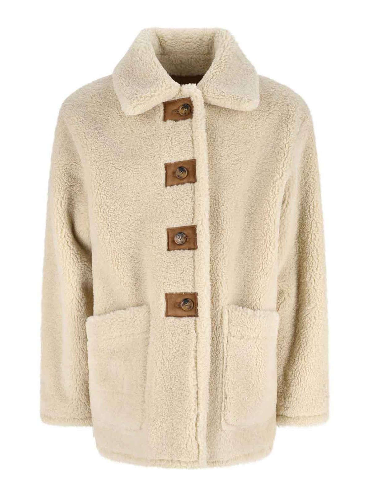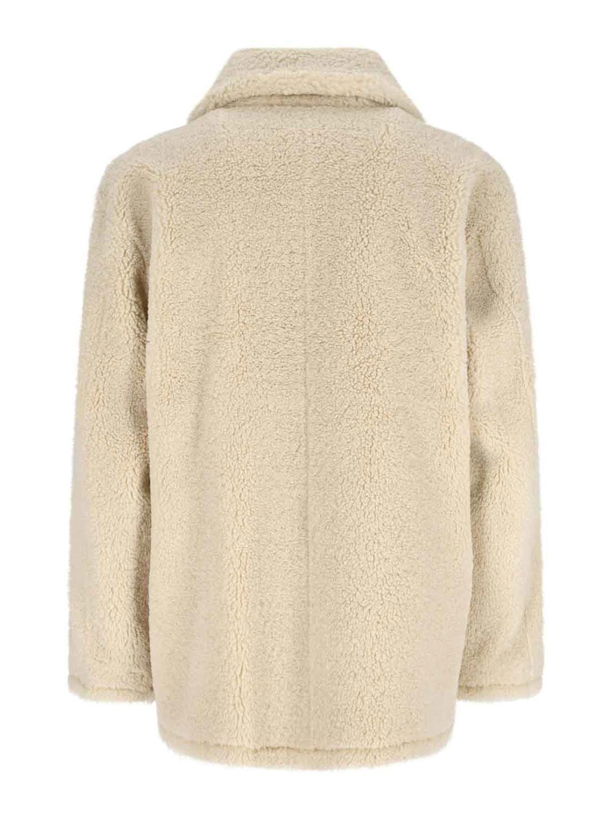 Giacca reversibile dunst, in tessuto scamosciato marrone da un lato, motivo teddy bianco dall'altro, spalle scese, colletto ampio, chiusura bottoni, due tasche laterali, finiture in tessuto teddy, orlo dritto.